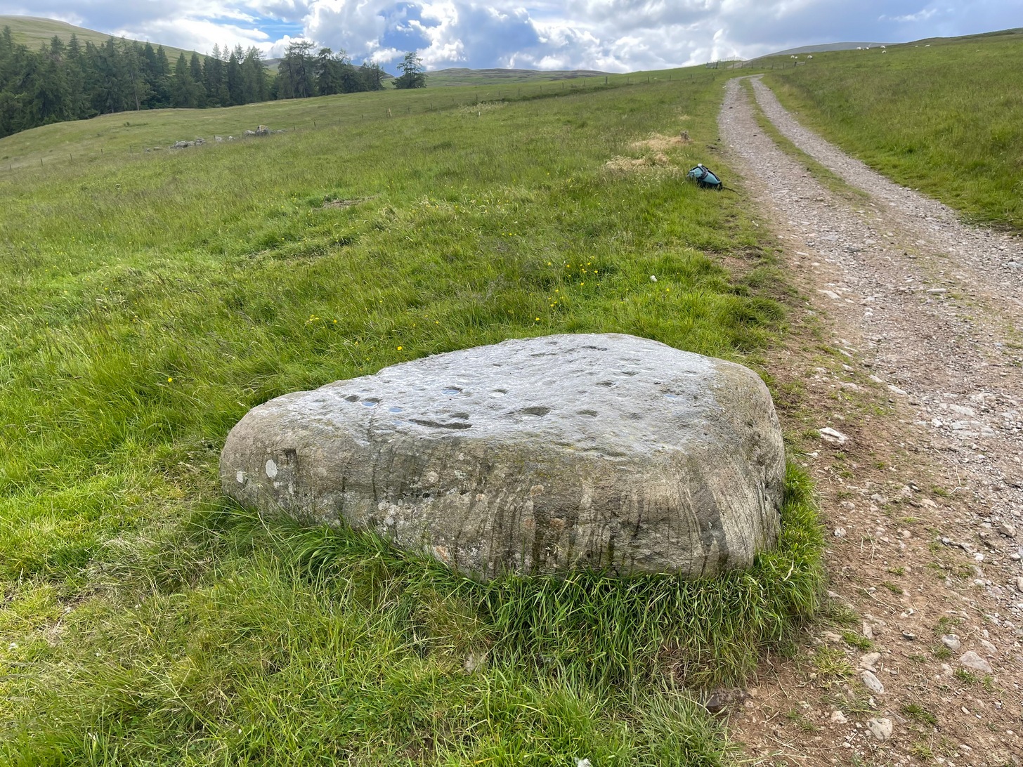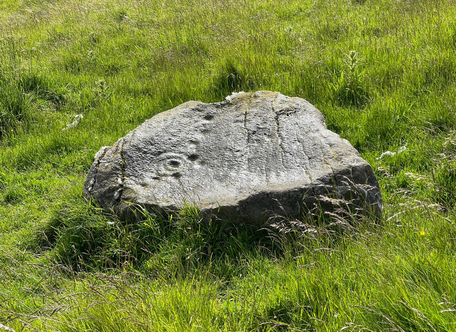So, nine cups in all: one with the double-ring around it, and two of the cups touching the outer ring. The cup-marks are ostensibly as Stewart described them, but there are another two or three which I was unable to capture in the photos, as the daylight wasn’t good when we came here. They’re shallow but very distinct when you see and feel them in the flesh, so to speak, and are closer to the top- and bottom-centre of the stone in the photos here. Well worth checking out if you’re in the area!