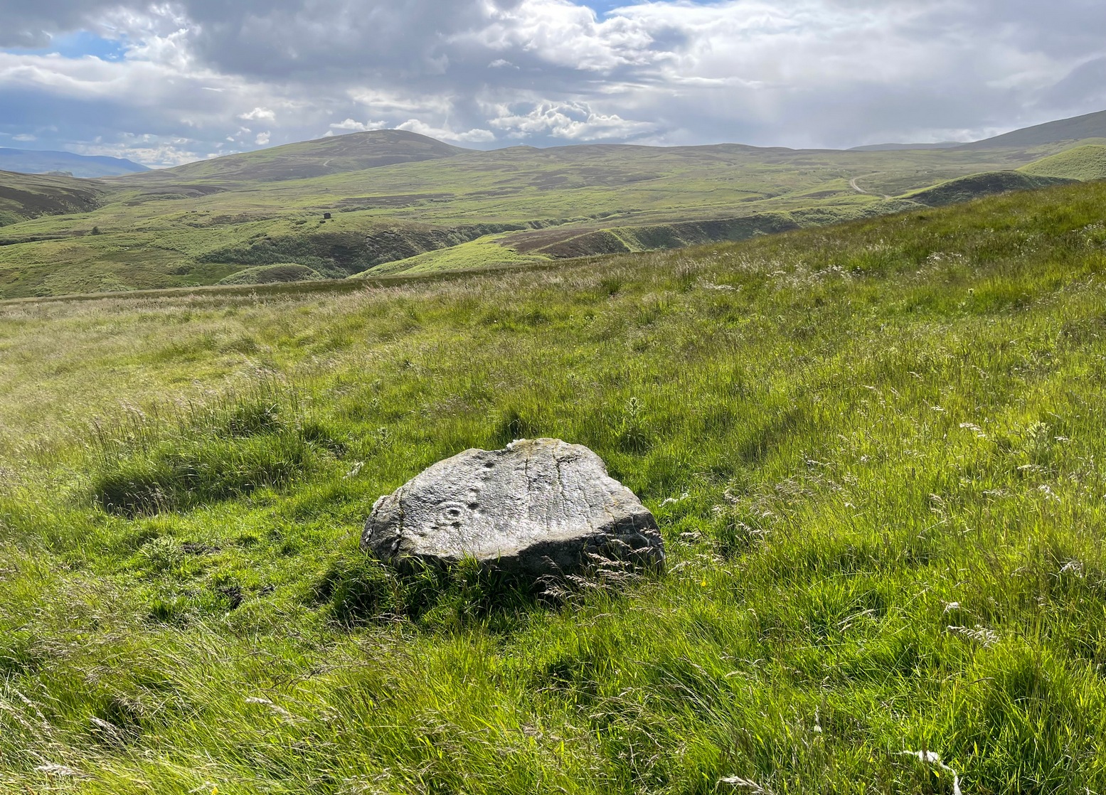 Along the A822 road from the Gilmerton junction on the outskirts of Crieff, heading up towards the Sma’ Glen, after literally 1¾ miles (2.8km) on the right-side of the road you need to follow the route to reach the Connachan rock art cluster by walking up the dirt-track leading up past Connachan Farm. Walk past the carving of Connachan (2) and up the track past Connachan (4), then onto the level ground and walk right to the low-lying ruined Connachan cairn. From here, look up the gentle slope to the fence. A small-ish stone protrudes out 40 yards away. Head straight for it!