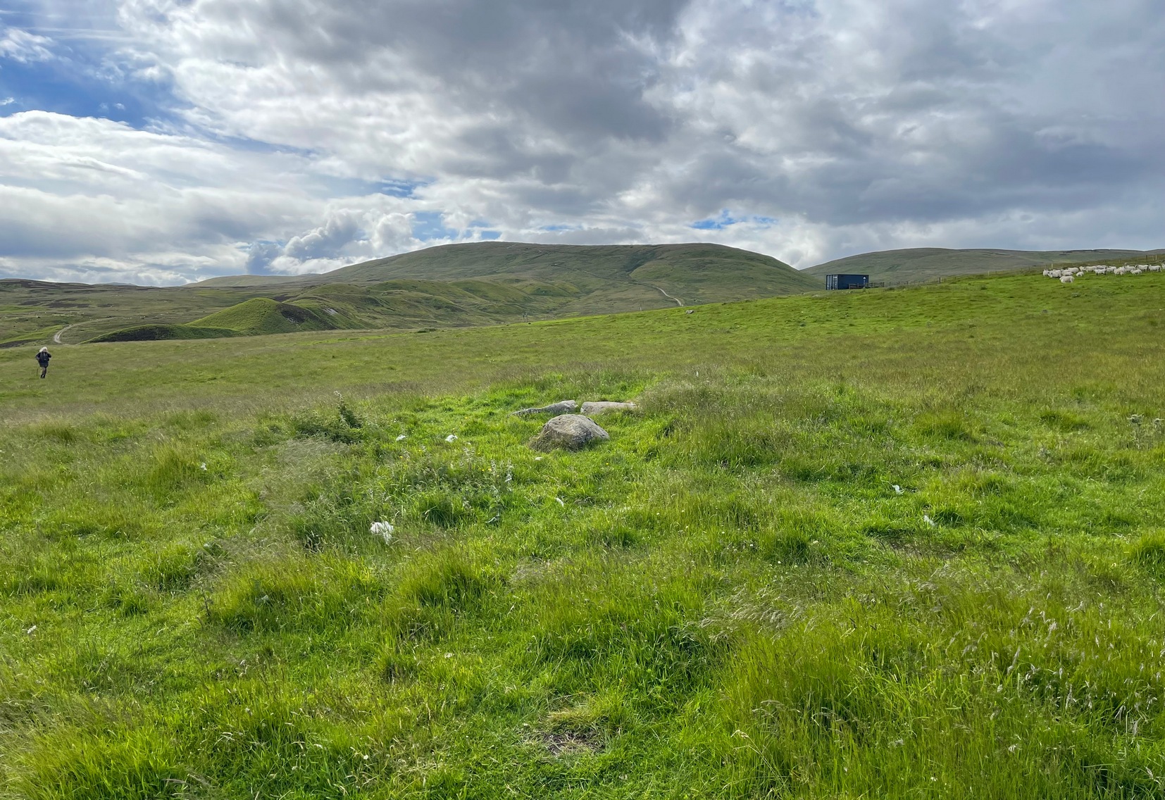 There’s nothing truly notable about this much-overgrown cairn and you could very easily walk past it without noticing it was even there! Much of its original mass has been removed and, no doubt, its stones reused in the old walling a few yards to the north (a long section of that walling appears to have a prehistoric provenance). It measures roughly 10 yards across and its outer edges are clearly visible as a raised grass-covered mound all round, just one or two feet high at the most. Obviously it was much larger when first built, but all that we see now are its final ruins, four or five thousand years after its birth… The one thing of great note here is the view: you’re looking from east to south to west across an awesome landscape for many many miles. Check it out!