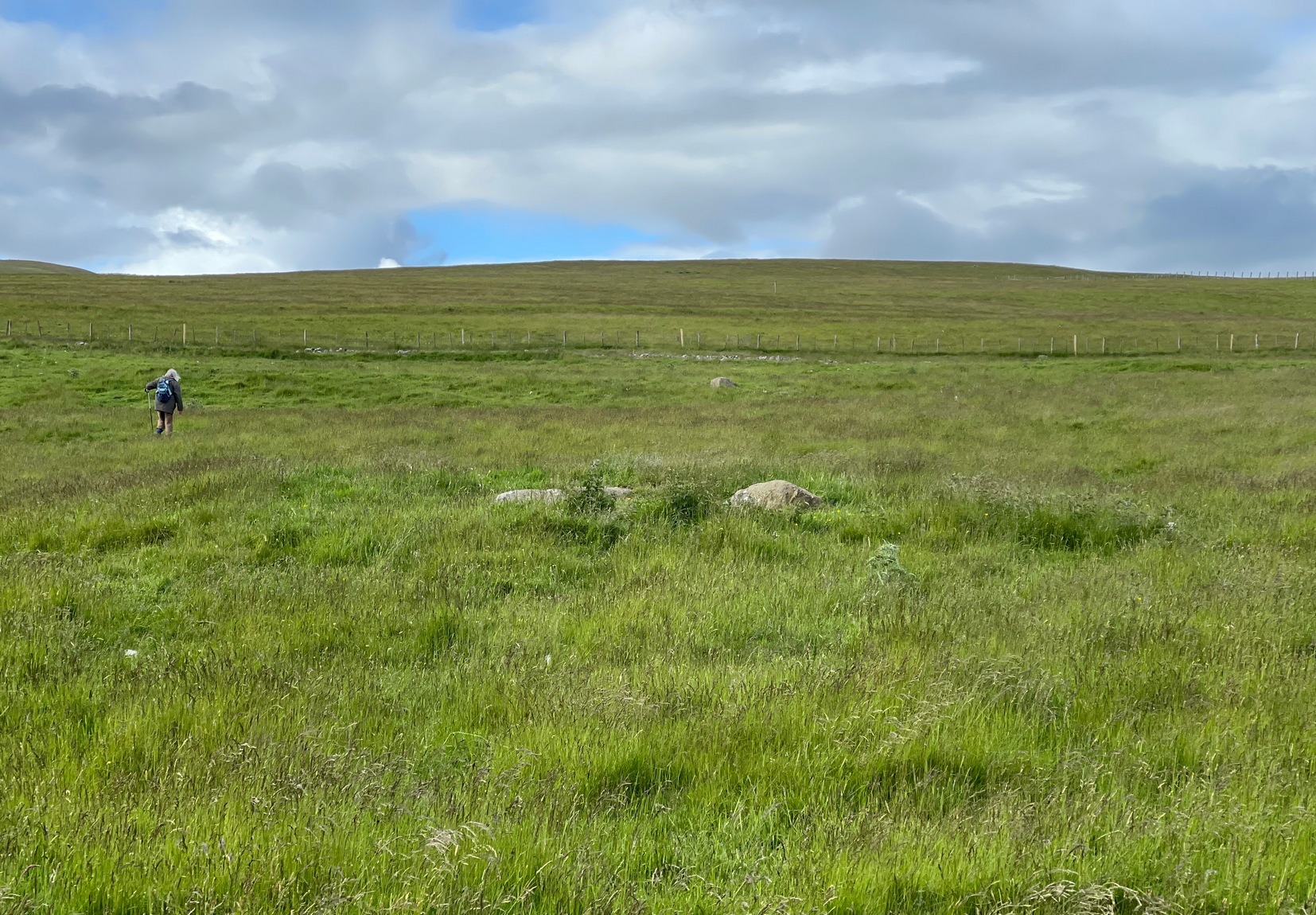 A couple of miles east of Crieff, take the A822 road from the Gilmerton junction and head up towards the Sma’ Glen. After literally 1¾ miles (2.8km), on the right-side of the road, you can park-up right opposite the dirt-track that leads up to Connachan Farm a half-mile away. Walking up and then past the farm, go past the Connachan (2) petroglyph, keeping on the same track uphill and just past the (Connachan 4) carving the land levels out where the track curves. From here, walk to your right, into the grasses, and about 90 yards along you’ll see a small rise in the ground with two or three fallen stones in the middle.