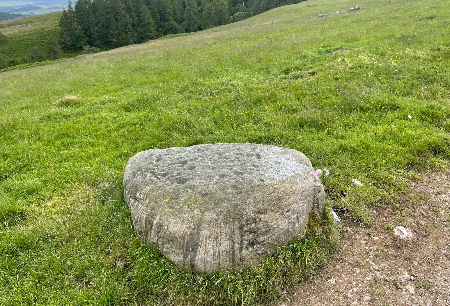 You’ll check this out when you’re doing your tour of this petroglyph cluster and sit here to admire the view. It’s the last of the small bunch of carvings, on level ground, close to the denuded cairns. It consists of just eight cup-marks, all of which are carved close to the edge of the stone on its upper sloping surface; although this doesn’t tally with Margaret Stewart’s (1967) description of any of the carvings hereby. There’s nowt much more to be said about it to be honest; apart from saying how it’s highly likely that other carvings remain hidden, undiscovered, not far from this stone along the edge of these hills.