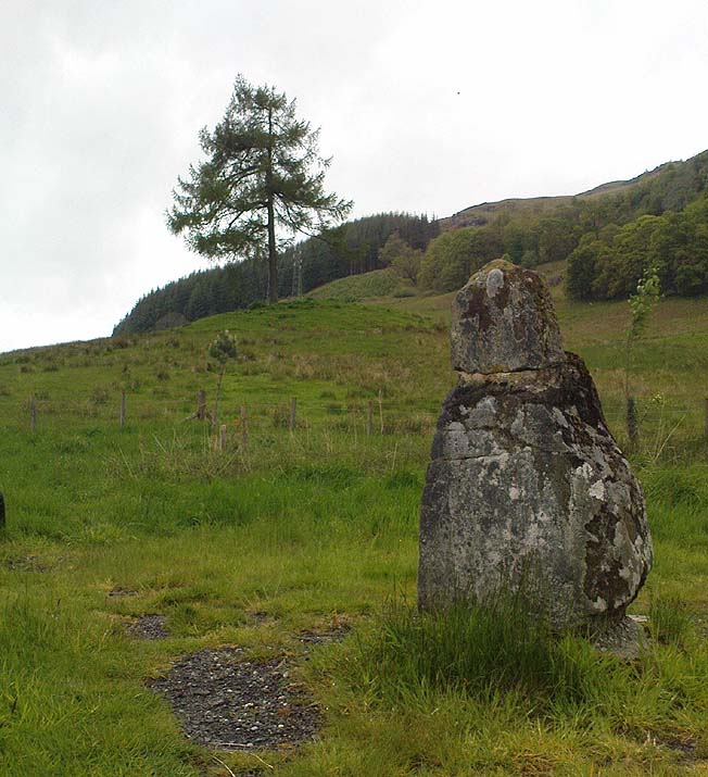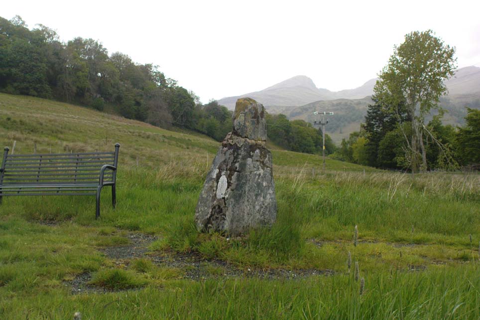 “Both the Old and New Statistical Accounts of the parish of Killin make reference to a site near the village that had been pointed out from time immemorial as the burial place of Fingal, the hero of Celtic folk stories. At this point, which is in the middle of a field immediately behind the schoolhouse, there is a standing stone 2 feet 8 inches high and 5 feet in girth. The stone had fallen, but in 1889 it was re-erected by Mr Malcolm Fergusson, a patriotic native of Breadalbane. Without any reference to the original arrangement, a smaller stone was fixed on the top, and others were placed near it. The lands in the vicinity of Fingal’s Stone used to be called Stix. The name suggests that here, as at Stix between Kenmore and Aberfeldy, there were a number of standing stones, of which this one alone remains.”