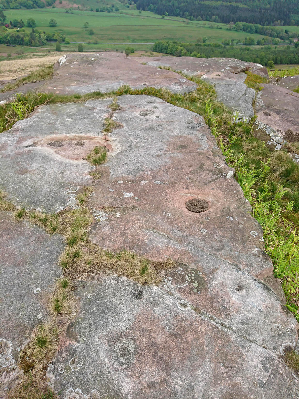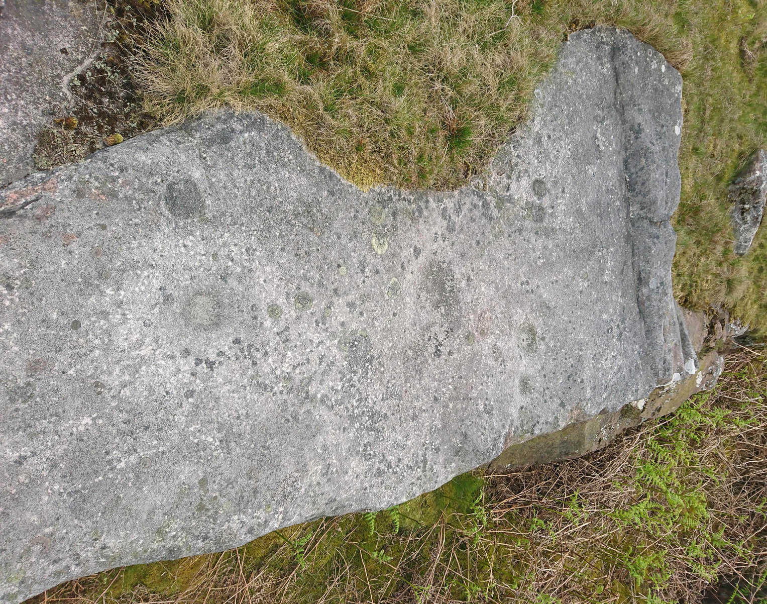Nowt special to look at, this is merely an elongated earthfast female stone that will be hard to find when the reeds grow high. The design consists of at least three cup-marks, with the most prominent one near the middle of the stone. A second one is shallow and on its northern side, near the middle; whilst the third one on its southern side was uncovered when we peeled back the vegetation; the peck marks are still visible. In the photo to the left I’ve placed numbers below the position of the respective cup-marks. In a cursory meander here, we found no other carvings – but that doesn’t mean there aren’t any!