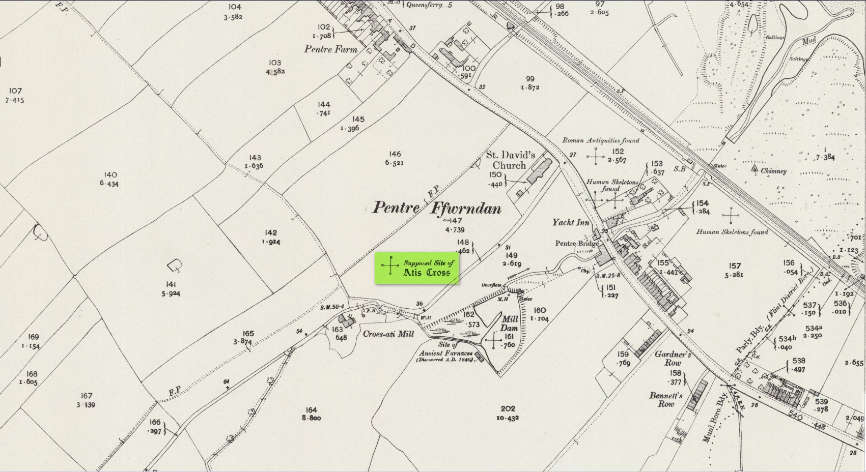 This long-gone site, described in the Domesday Record of 1086 as Atiscros Hund, (or “hundred”, which is the word given to an administrative division of land which, at that time, was on the western edge of Cheshire bordering Wales), gained its title from an old English personal name, Æti. The fact that it stood on an ancient boundary and was included in Domesday, means it would have been a stone cross. Its location was shown on the 1871 Ordnance Survey map (and several subsequent ones), based on traditional accounts about its position. The site is still preserved in local street-names.