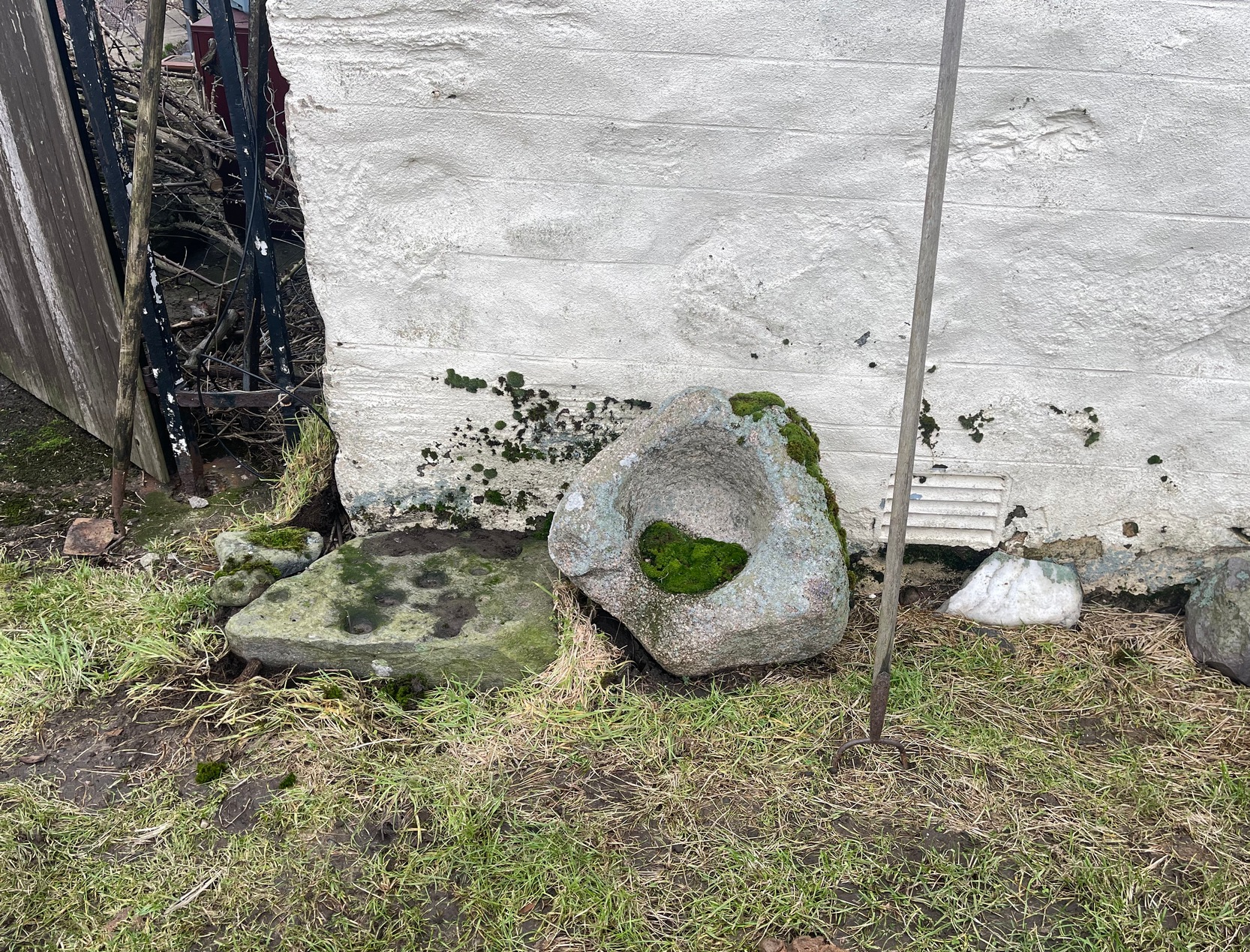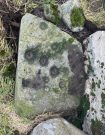 Altogether there are 24 or 25 mainly well-defined cup-marks on this thin slab, covering most of the surface. In a couple of places on the stone, two of the cups are conjoined. There are apparently no cup-marks on the other side of the stone.