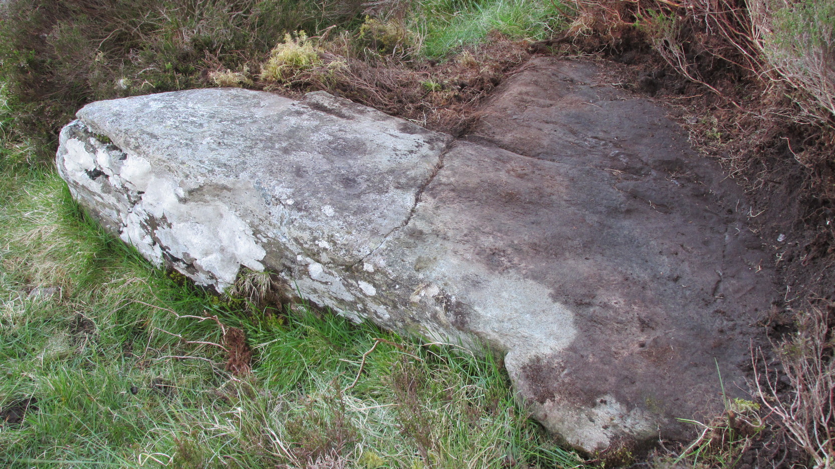 “A large glacial erratic boulder with ten cup marks scattered over its surface lies in a field one sixth of a mile SSE of the ‘four poster’ and ruined stone circle at Heatheryhaugh. The boulder is garnet mica schist and is 3m long, NS, by 2.70 wide, EW, with a circumference of 9m at ground level.”