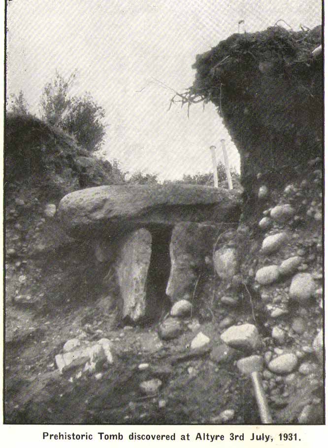 “as such tombs are called, had been discovered by workmen who were digging sand from a mound just by the main road to Grantown.  Flat, rectangular stones formed its ends and sides; its top was a single slab of massive proportions.  All around were packed smooth. water-worn boulders, that had once lain in the bed of the Findhorn.  The opening of the cist revealed the ashes of some long-departed dweller in Moray, together with pieces of what had been beautifully moulded pot of clay. On examination of the remains by antiquarian experts, the date of the burial was estimated to be at least a thousand years BC.”