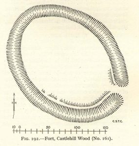 “In Castlehill Wood, about 250 yards to the southwest of Bogside Railway Station, and at an elevation of 200 feet above sea-level, is a small plateau of very regular oval form with its major axis northwest and southeast. It is surrounded by a single ditch, the well-marked enclosure thus produced having a maximum measurement of 185 by 135 feet. At the southeast the ditch has been left uncut in order to provide a passage for entrance. This passage has been about 20 feet wide, and at its inner end there are on either side faint traces of a low mound, which in all probability once ran right round the edge of the enclosure and which may have been palisaded.”