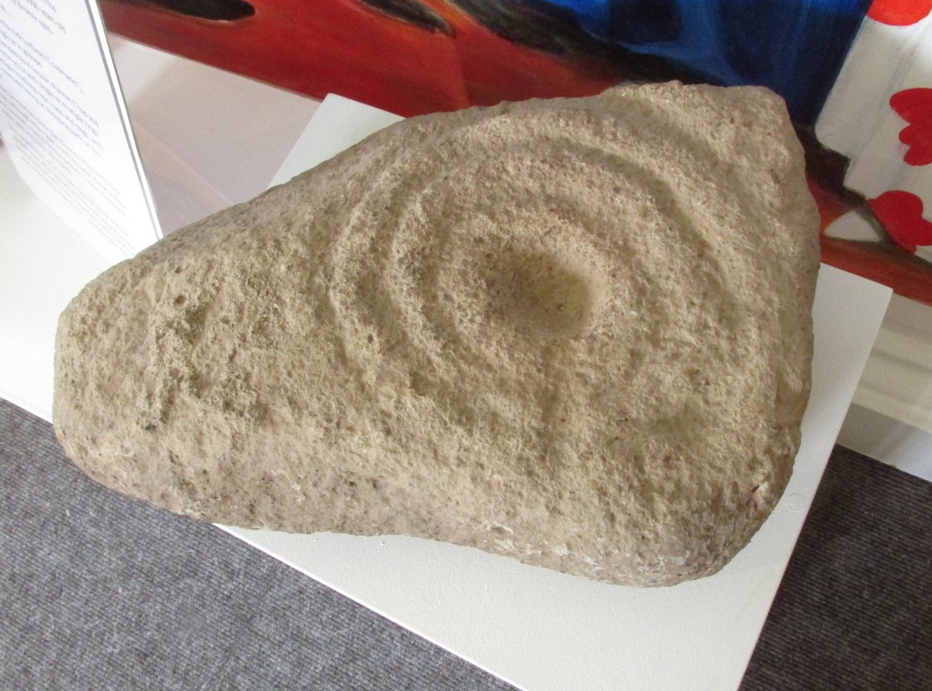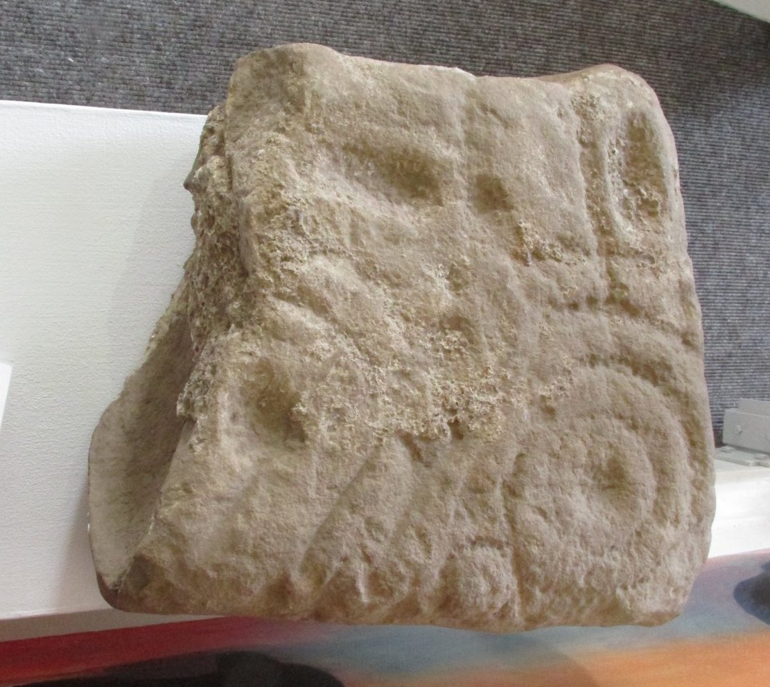 One of two petroglyphs housed in the Gala House Museum, whose background is somewhat of a mystery. When the northern antiquarian Paul Hornby visited the museum, his enquiries regarding its history and place of origin drew a blank. This small squared block of stone has obviously been broken from a larger piece, but the whereabouts of its adjoining fragments are unknown. The section that remains that we see here is somewhat more complex than it’s companion petroglyph, comprising as it does (in the photo on the right) a concentric cup-and-two-rings,with another arc above it that has a carved line running vertically into it. An elongated cup-mark sits to the side of this line. On the lower-left side we can see where a fragment of the stone has been broken off and here is a cup marking with a double arc above it, that may originally have been another cup-and-two rings. The curious angular lines at the bottom of the stone look like more recent scratches, perhaps from an industrial machine (tractor?) created when the stone was moved from its place of origin. If anyone knows anything about this carving, please let us know.