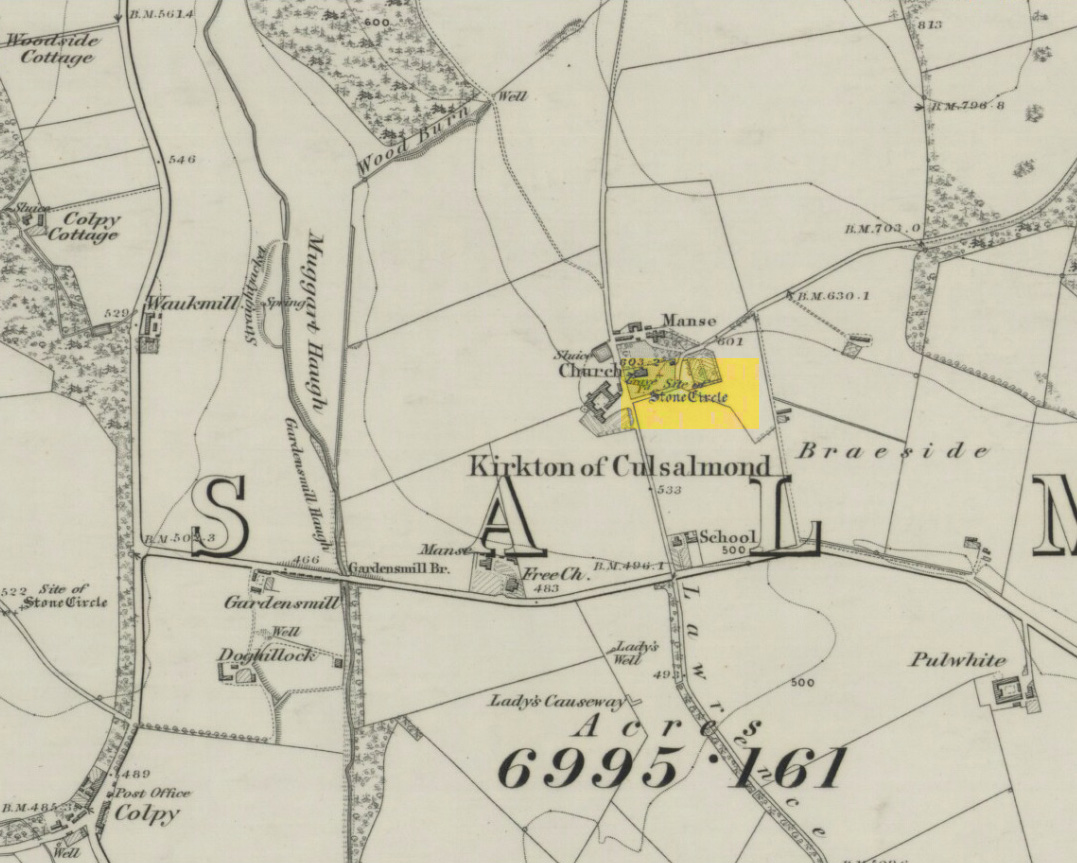 Just like the stone circle a half-mile east at Kirkton of Culsalmond, nothing now remains of this megalithic ring.  It was first described very briefly by Rev. F. Ellis (1845) in the New Statistical Account as a “druidical temple”: one of two hereby, “on the farm of Colpie, although now almost obliterated. Several urns were dug up in making a road near one of them”—implying that one of them was a cairn circle or funerary monument of some kind.  This was subsequently affirmed on the early OS-map and then described in Fred Coles’ (1902) survey, where he wrote: