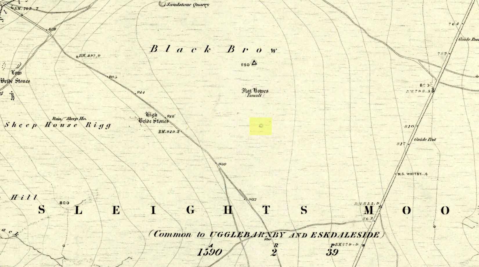 Along the A169 road that runs may miles from Whitby to Pickering, as you go through the small town of Sleights, the road gets steep for a mile or so, until you reach the moorland tops, where the road runs dead straight. After 1.2 miles (1.93km) along the straight road, a small minor road is to your right. Go along here for literally half-a-mile (0.8km) where you’ll see a small dirt-track on your right, with a locked gate. There’s place to park here. You’ll see the large rounded mound of Flat Howe-2 about 200 yards NE. Head there, then another 250 yards north. You’ve arrived!