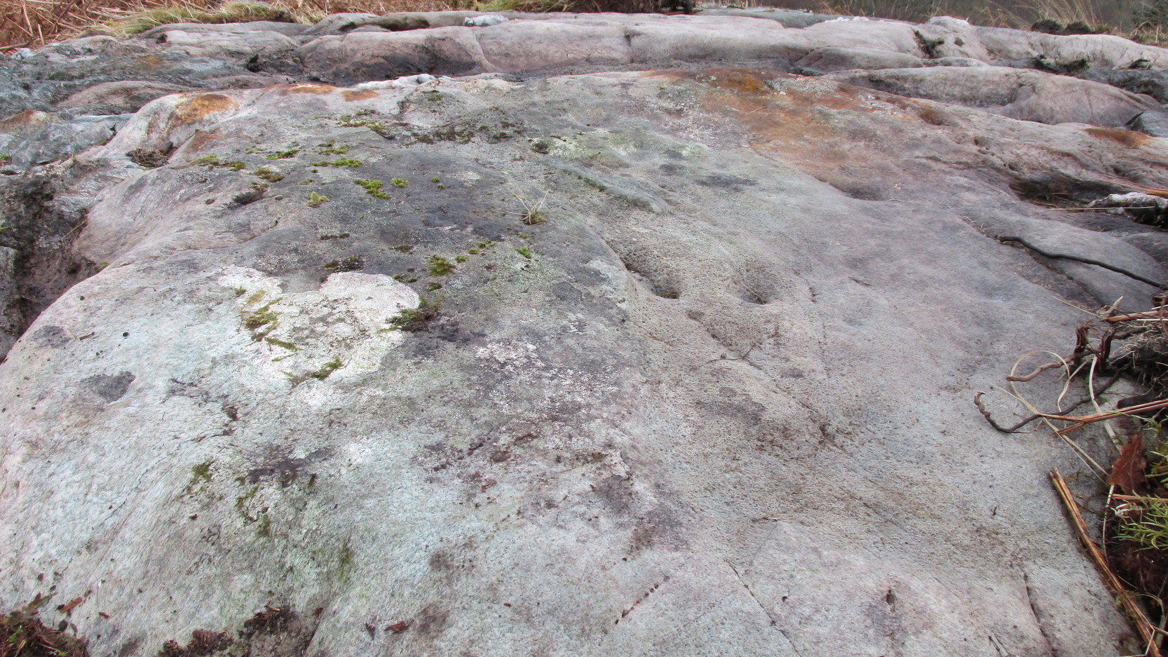 From the topmost section, the rock then slopes gradually downward and the design is broken by several natural splits in the stone before we reach a single unfinished cup-and-ring and a solitary cup-mark. These occur shortly before we reach a near-duplicate of the multiple-ringer that we’ve just seen on the flat top of the stone. The outer ring of this is broken and the edges of it are intruded (again) by natural cracks in the stone (a not uncommon feature). The erosion level of this and its fellow four-ringed compatriot at the top are much the same, suggesting that the two were executed at around the same time.