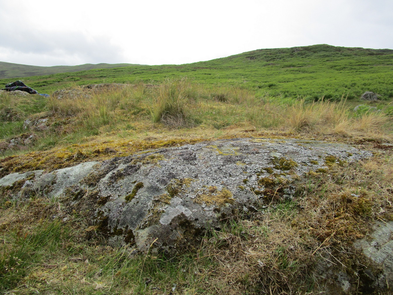 From Kenmore go east up the steep mountain road towards Glen Quaich, or if you’re coming from Amulree, go west along the same glen. After 2½ miles (4km) up the Kenmore route (nearly 9 miles on the Amulree route) you’ll reach a small lochan on your left (you’ve got a very small parking spot a coupla hundred yards before the loch). A gate and stile past the loch takes you east along a track into the moors. More than a mile on, the track splits, but you need to keep to the left and follow the track along the wall-side for another 400 yards or so, where you’ll see a small crag of rocks 100 yards down the slope on your right. Once here, the deformed triangle-shaped stone to the left-side of the cluster is the one you’re looking for.