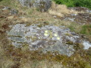 About four yards west of the Craig Hill cluster (3) carving, this gently smooth sloping rock was initially noted to have between six and seven cup-marks on it. Under the grey skies it was difficult to see any of this clearly, and so we wet the surface when Nature gave us some short bursts of light through the clouds which then enabled us to get a much better look at the design—but it’s still far from clear.