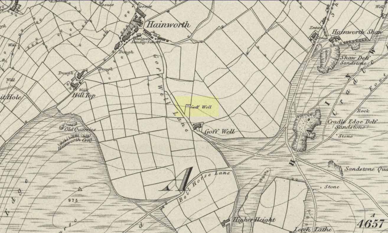 “Goff Well, close to the road on Harden Moor leading to Hainworth, has given name to a neighbouring farm, but the purpose or virtues of this water are not now known.”