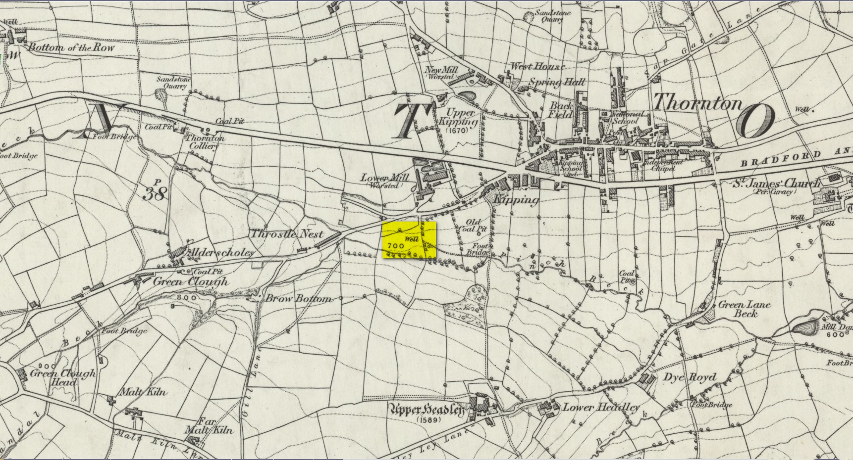 Southwart later tells us that the ghostly dog travelled into the north and vanished. From the description she gives of the children walking their friend to “the end of the passage which leads to the fields, and gazed into the black well, at the bottom of which lurked the Bloody-tongue,” I can only surmise that the solitary well shown on the very first OS-map of Thornton at the coordinate given above is the place in question.