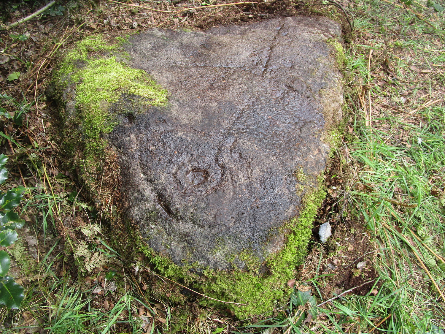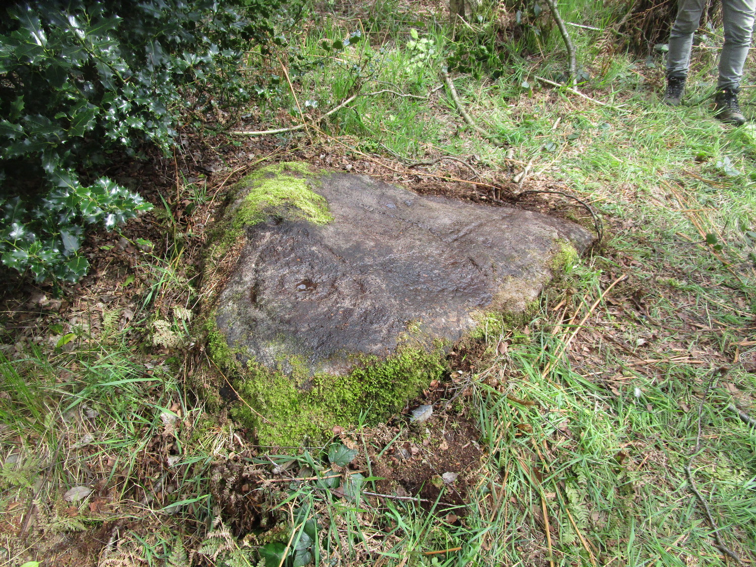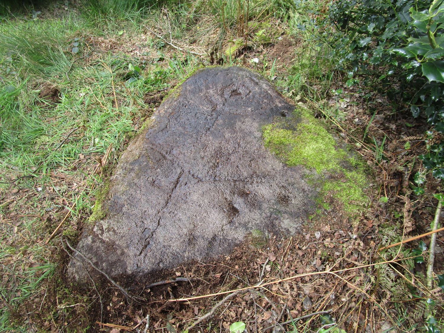Follow the same directions as if you’re visiting the Gab Woods (1) carving—which you’re probably visiting if you’re checking this one out. Walk south into the middle of the woods and you’ll soon notice the road/houses on the other side of the trees. Once here, staying in the woods, follow the walling down for about 100 yards, keeping your eyes peeled for a reasonably large flat stone about 15 yards from the wall in the trees. If you can’t find it at first, patiently zigzag back and forth until it eventually appears!