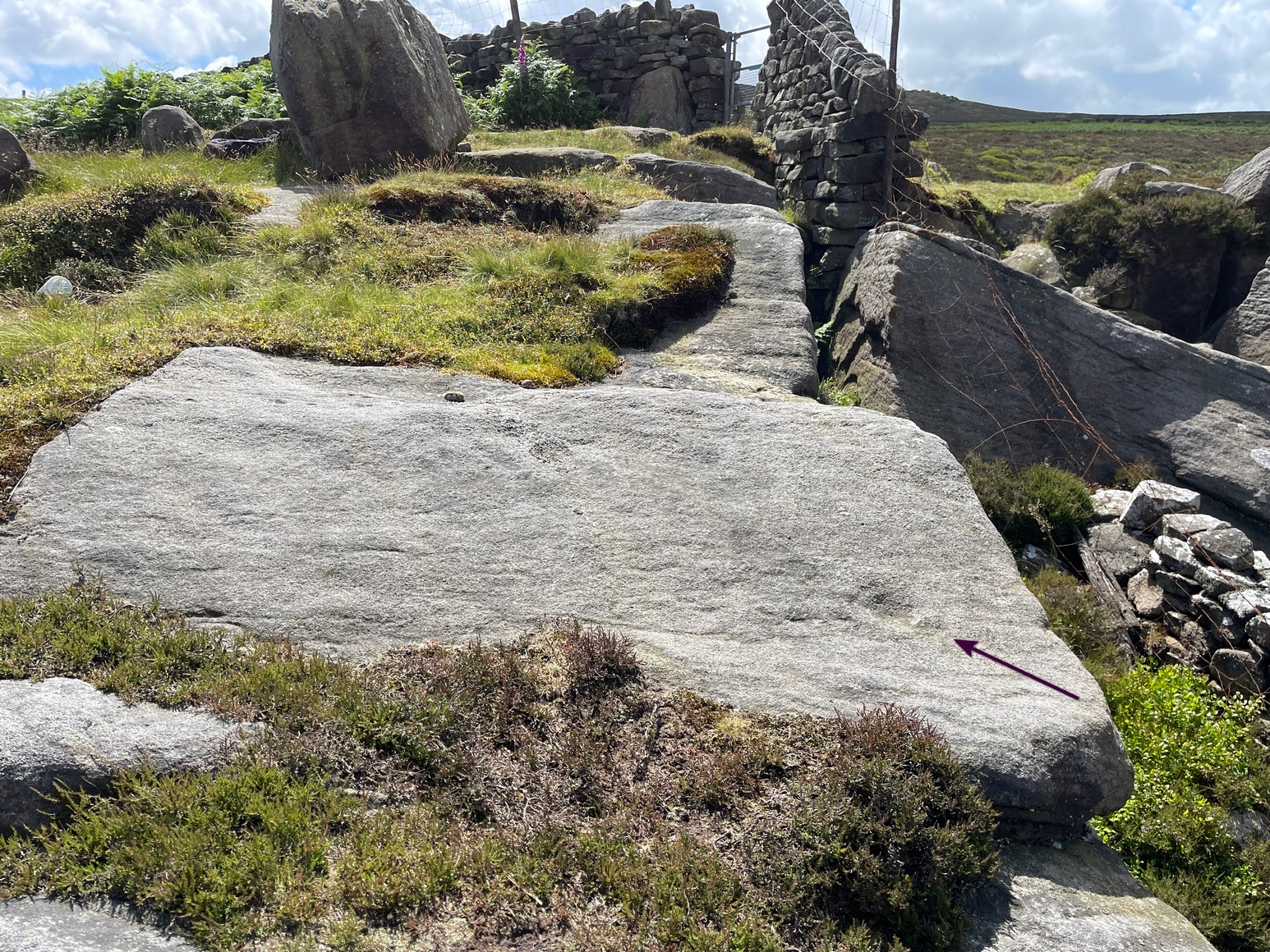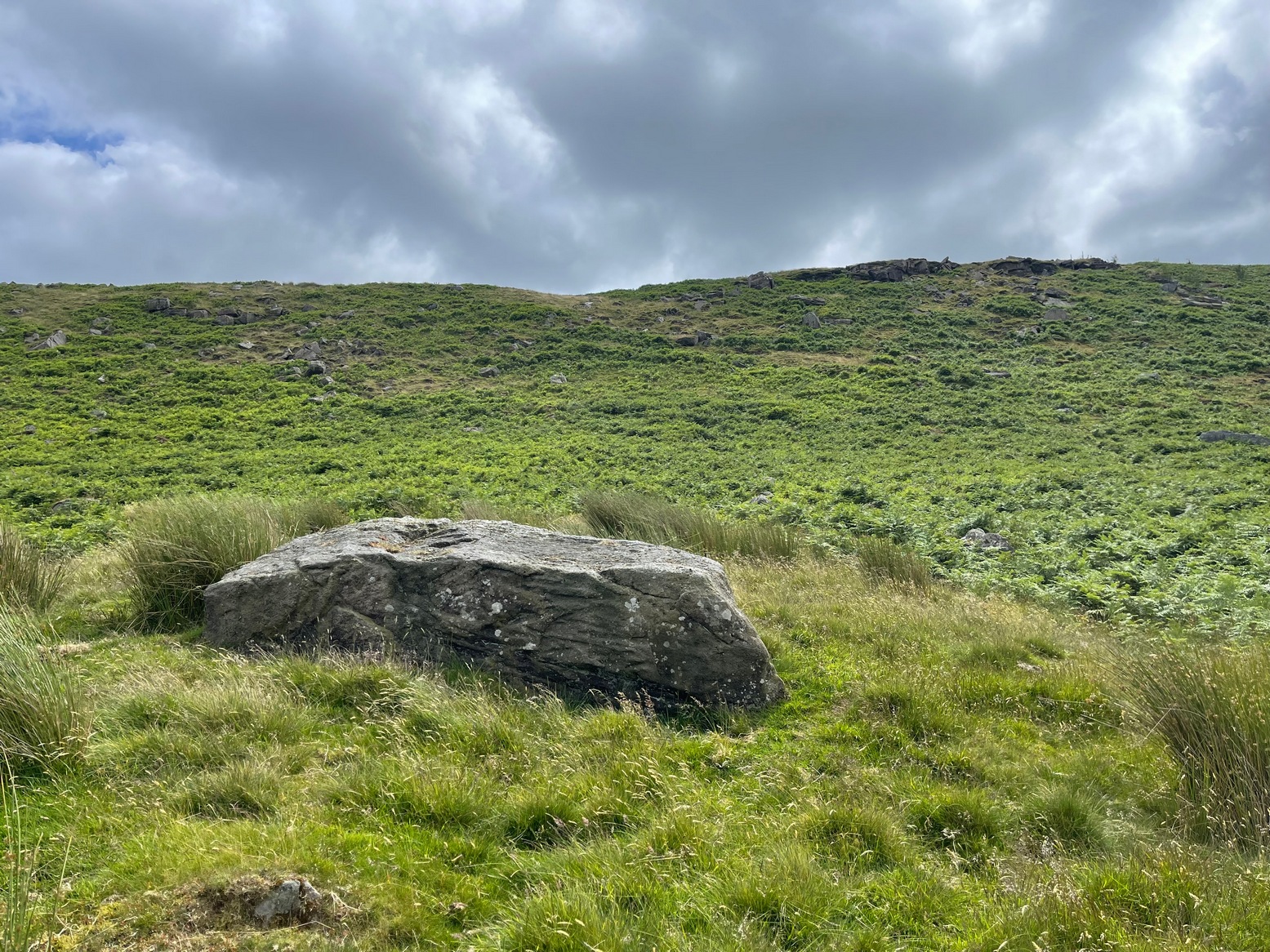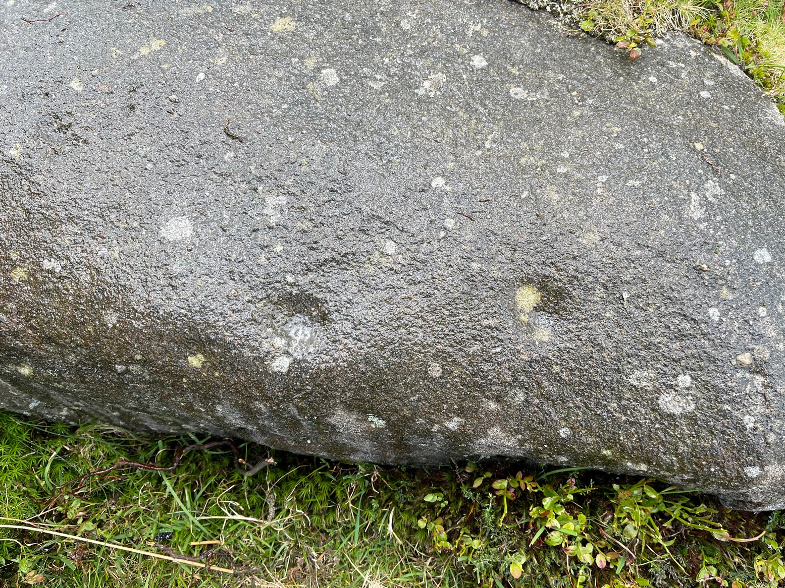 During a walk I did with a small group of people in the Spring of 2024, after a series of heavy rainfalls we ended up having to veer on and off the footpath to ensure we didn’t get swallowed in one of the bogs! In doing so, one of the group, Sarah Walker, noticed a small, almost portable-sized stone sticking up out of the edge of a peat-bog with a very distinct single cup-marking on it. (it may have been on its way as an offering stone to the Little Skirtful cairn) Sarah twizzzled it round a few times in the mud so we could get some good photos of it before we went on our way to the circle at Horncliffe. We didn’t get an exact position for the stone, but it can be found somewhere roughly over halfway between Roms Law and Horncliffe, not far off the path. Good luck!