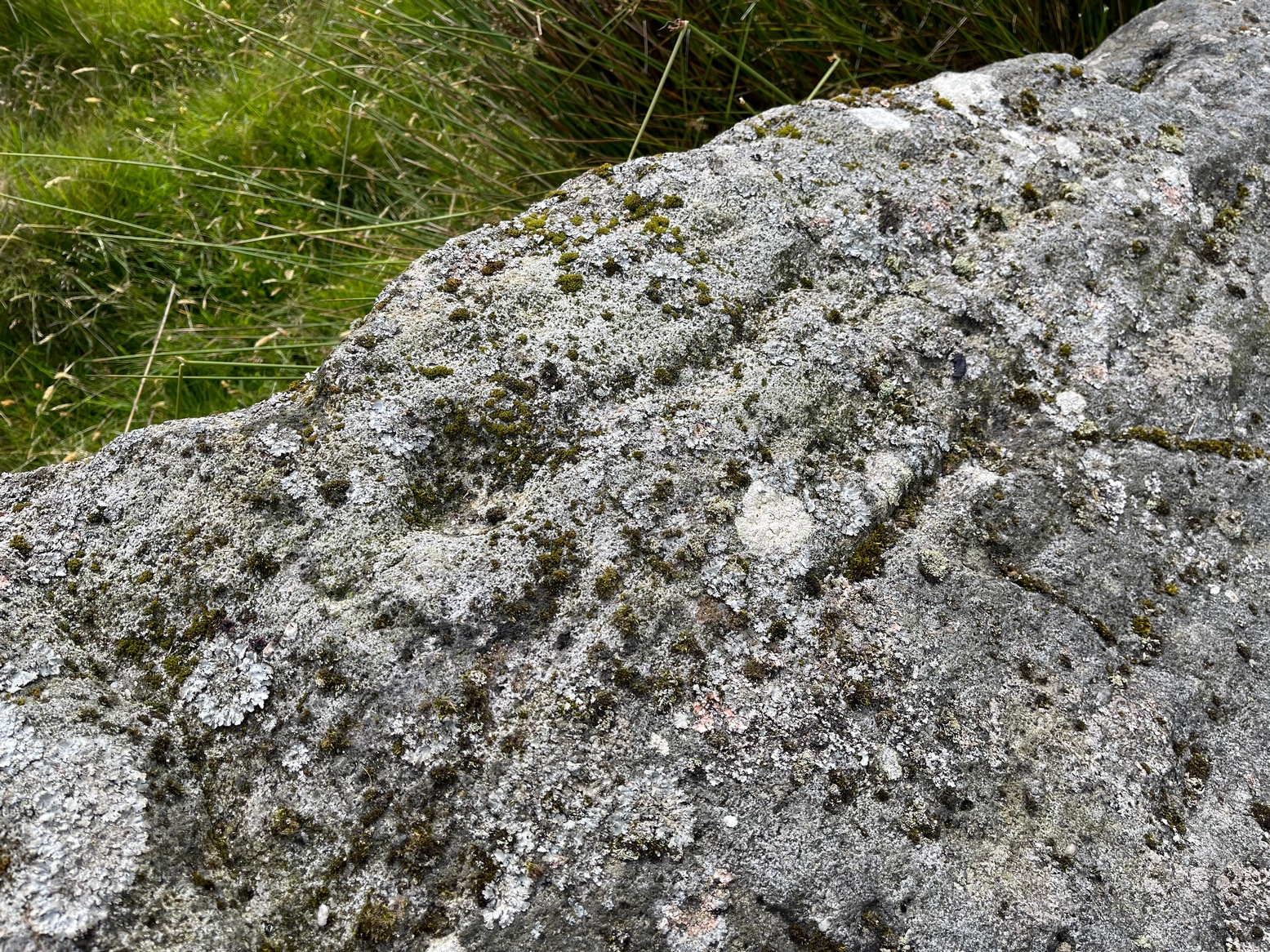 On a recent visit to the Fraggle Rock carving, Tom Cleland foraged about at the edge of what was, in centuries gone by, a good flowing stream below the west slope of Reva Hill. An old pathway cut across one section of it near where the walling now runs, covered these days in the mass of Juncus reeds, typical of mashy grounds. And here, just where folk would cross the waters, Tom found a good sized stone with a single deep cup-mark on its crown, calling through a feast of lichens to be seen once more. There may be a second cup-mark by its side, but the light wasn’t good when we were here, so that’ll be worked out some other day. Anyhow, this one’s probably only for the crazy petroglyph hunters out there. It’s the Fraggle Rock and its companios that you’re gonna be looking for, nearby….