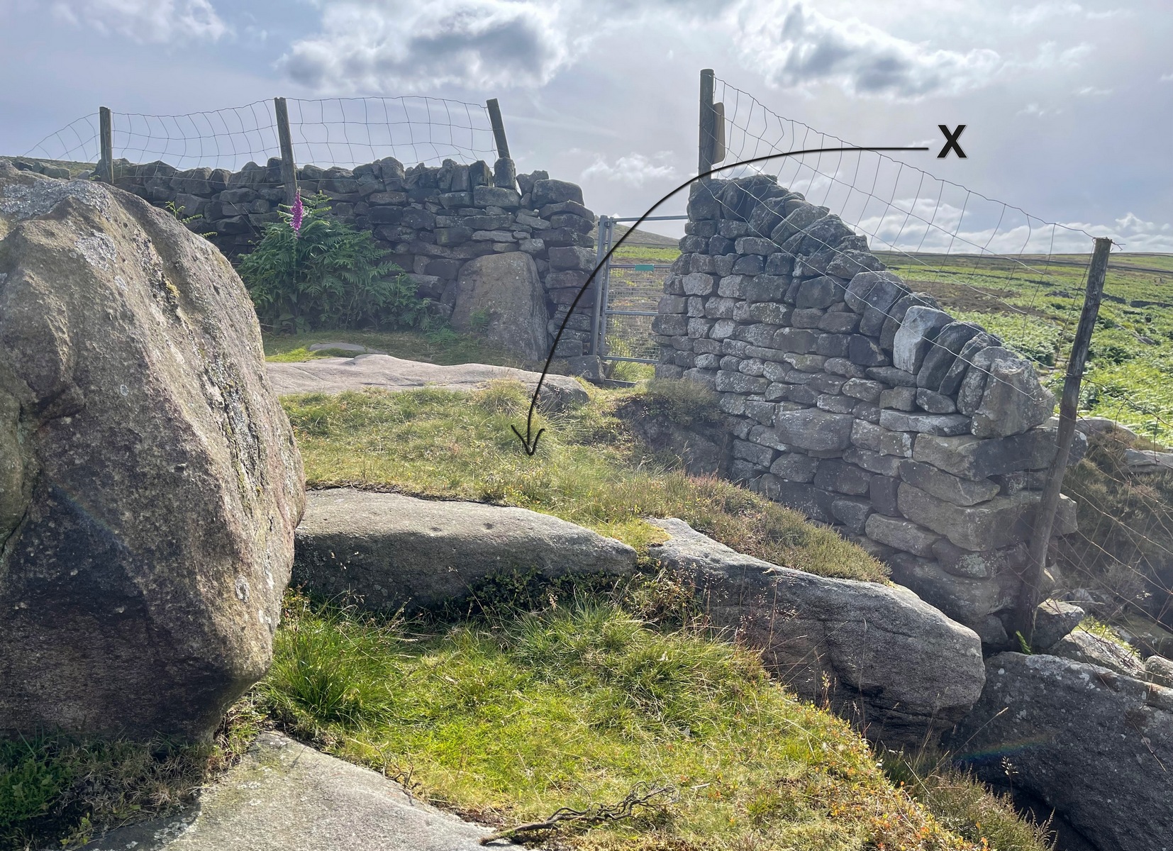 Measuring roughly 25 yards (SE – NW) by 21 yards (NE – SW), this overgrown oval ‘ring’ is a similar architectural structure to the more famous Roms Law circle more than half-a-mile northwest of here—but bigger! And, unlilke Roms Law, this overgrown circle seems to have been untouched for many centuries. The oval surrounding ‘ring’ itself is composed of thousands of small packing stones between, seemingly, a number of much larger upright stones, reaching a maximum height of more than three feet high at the northernmost edge. The ‘ring’ ostensibly looks like a wide surrounding wall which measures two yards across all round the structure.