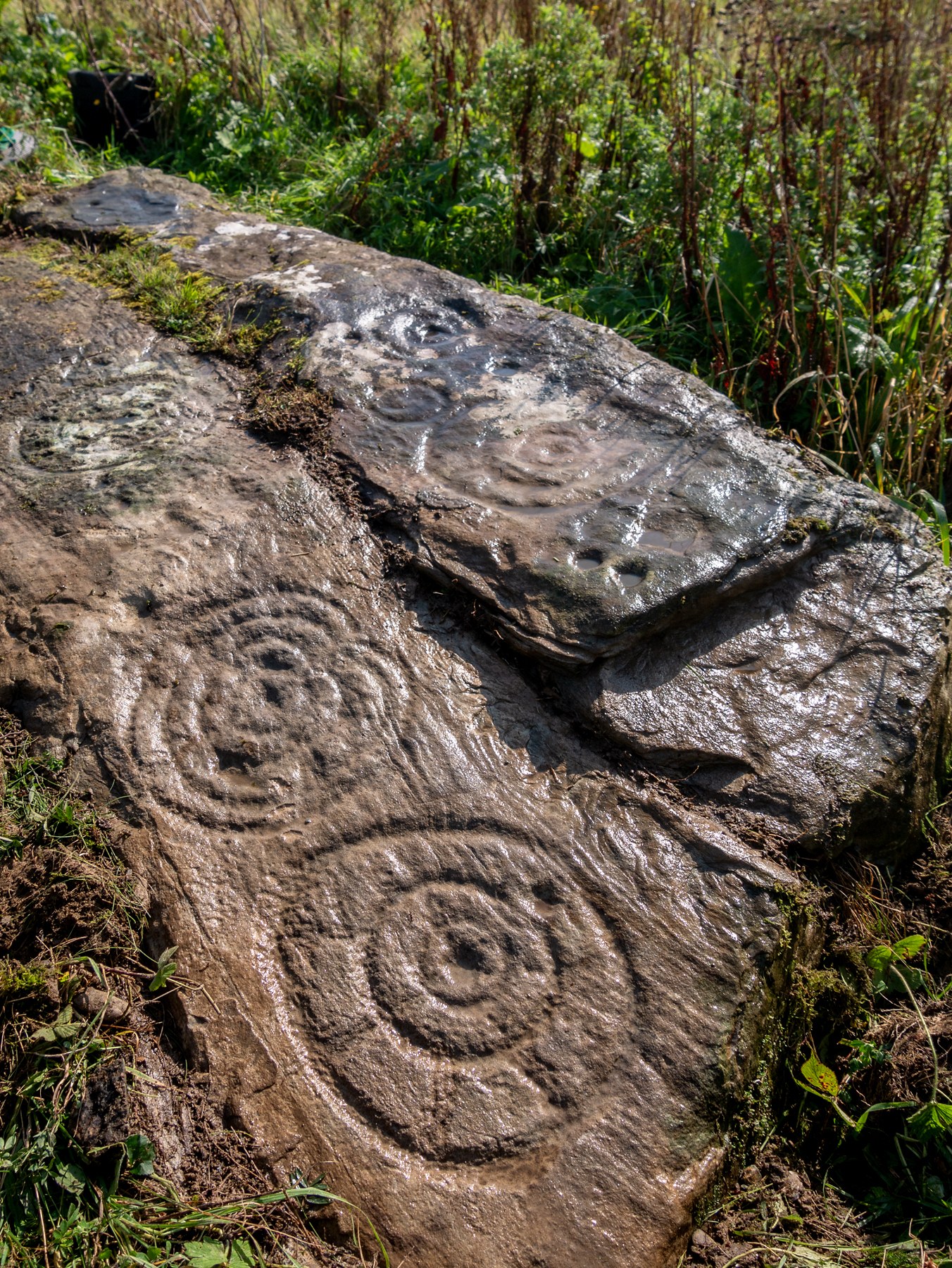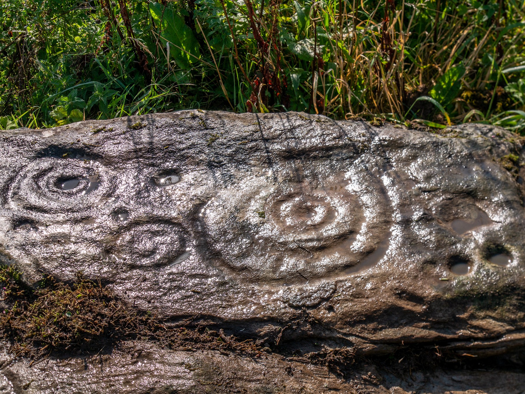 Etched onto a sloping stone overlooking the blue panorama that is Loch Swilly, this petroglyph has a 180º view of the landscape, from the southeast through to the northwest. This panorama—unimpaired by trees thanks to its proximity to the sea loch—was probably an important ingredient in the mythic function of the carving and is something we’ll return to shortly…