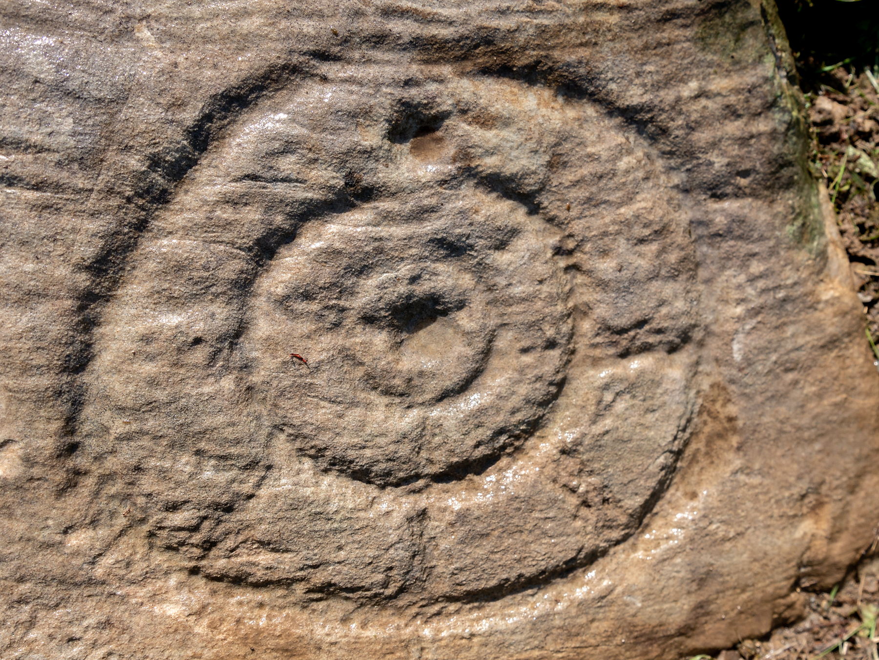 One of the most impressive elements in the overall design is the solar motif, i.e., a series of concentric rings (in this case three) with a number of ‘spokes’ reaching outwards as if to indicate the rays of the sun itself. This is shown clearly in one of Bettina’s photos here. This symbol is found on other neolithic carvings in Ireland: not least the incredible designs in the Newgrange complex where the solar alignment is unmistakable.