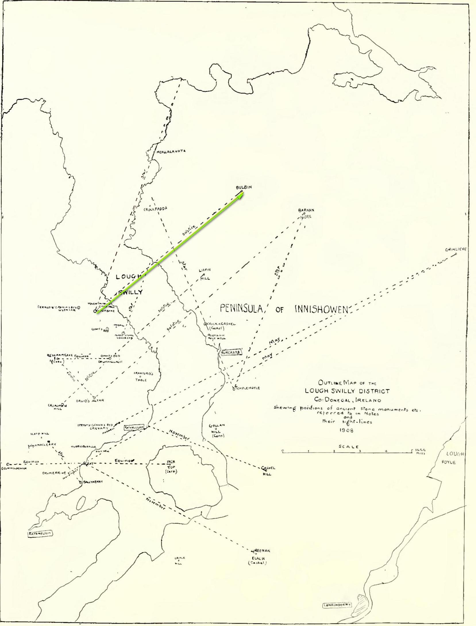 Intriguingly, one of the archaeo-astronony pioneers, Boyle Somerville (1909) wrote a article in the Journal of the Royal Society of Antiquaries of Ireland about a number of summer solstice alignments he thought existed in this precise locale. Amongst them was one he found running from the standing stone at Cloghbane on the other side of Loch Swilly—known as the White or Rowan Stone—heading northeast to the small mountainous peak of Bulbin, approximately 7.1 mile away. Somerville found that,