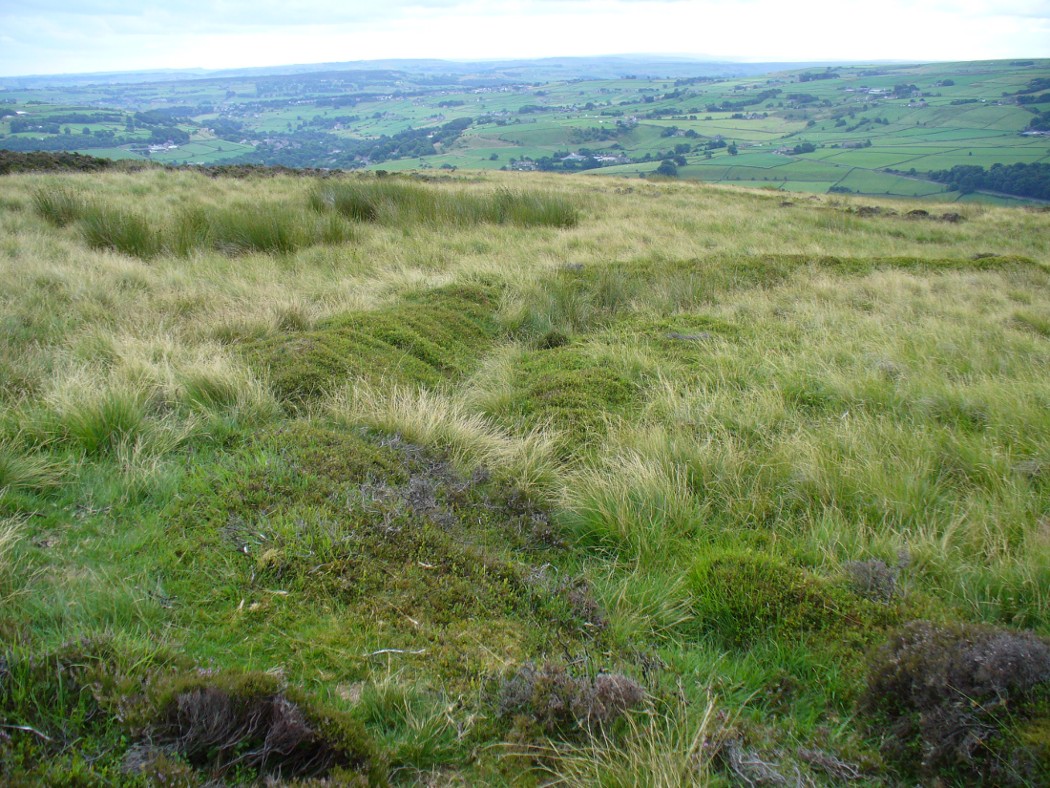 Walking along the track, it heads northeast for 80 yards, with low lines of raised parallel walling 4-5 yards apart defining the avenue, before it begins to gradually bend round in a more easterly direction. Thirty yards along this more easterly alignment, in the southern walled section, lays an eroded stone (SE 13255 44165) that seems to have stood upright in the not-too-distant past. It seems to mark an opening or gap in the walled trackway and a large scatter of small stones, akin to the denuded remains of a cairn is evident just below the track at this point. The raised embankment of the trackway keeps heading east, towards the line of Hawksworth Moor boundary stones.