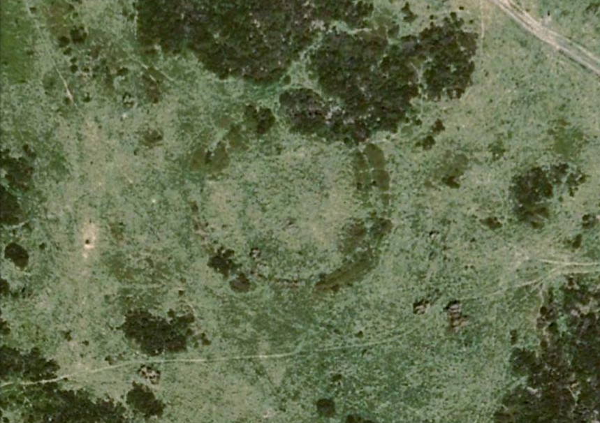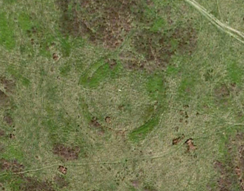 Best seen when looking down from the slopes above, this is a fascinating site that is lucky to still be here! For just a few yards to the west are extensive quarry works that could easily have destroyed the place had they continued. But thankfully we have here a near-perfect circular enclosure: measuring roughly 27 yards in diameter east-west, and about 25 yards north-south, the circumference around the outer-edge is approximately 82 yards (75m). It has all the appearance of an overgrown henge monument, with an outer bank and inner ditch, then a central flat arena—and it may indeed be such a monument—but until we have a decent excavation of the site, we’ll stick to calling it a simple enclosure—which it is!