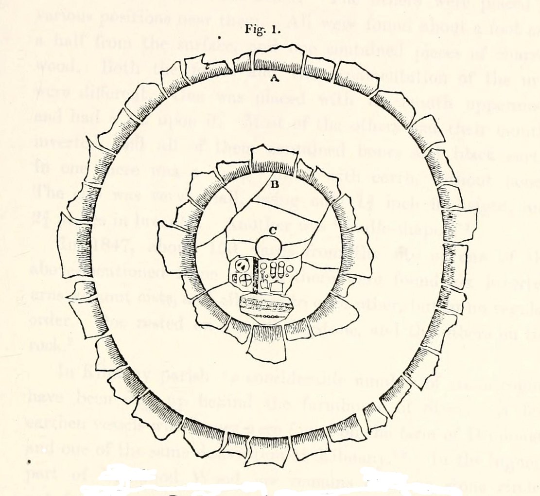 “The little evidence, however, which the plough and the harrow have left remaining, seems in favour of the latter. The regular and almost equidistant arrangement of the lines of dark soil in many parts, and the many fragments of cinerary urns found in nearly all of them, seem to indicate rather the orderly interment of a cemetery, than the more hasty burial of a battle-field; but this is by no means conclusive.