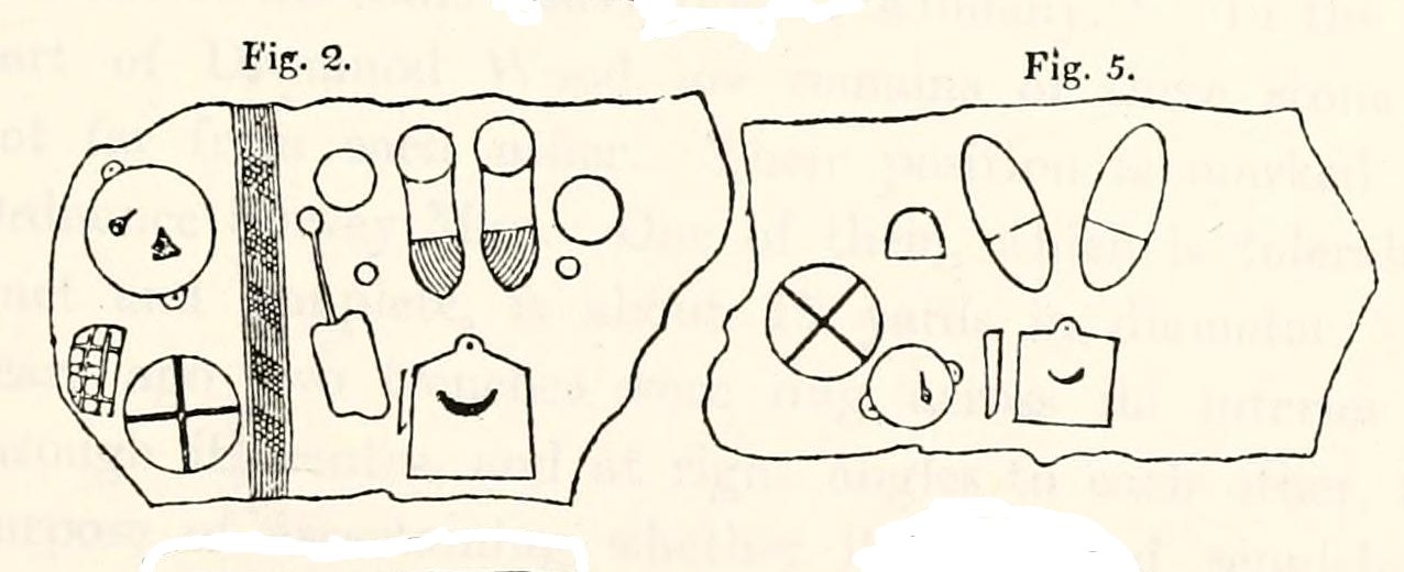 “Under one of the sculptured stones were found small burnt human bones and ashes. They were not enclosed in a cist, nor was there any building under the surface. Certain of the figures cut on one of the slabs of this monument are very similar to the figures on the sculptured slab of the one already mentioned. There are what appear to be representations of the soles of a pair of shoes, a circle with a cross within it — the limbs of the cross being: at right angles to each other — which may be intended to represent a wheel. On one of the stones is the figure of a spade. What the other figures represent is more uncertain. The sculptures raise difficult questions in regard to the time of the erection of these monuments. It is evident that cremation had been then practised at Creich, though the degree of culture and art indicated by the sculptures seems to point to a time subsequent to the abolition of this pagan custom elsewhere.”