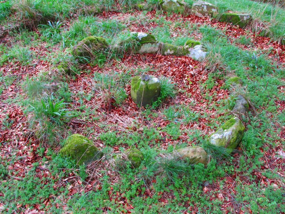 This is a simple but well-preserved circular monument, probably constructed in the Iron Age, just 100 yards past the incredible Douky Bottom cave (in which various prehistoric remains have been found). No excavations appear to have been made here, yet the near-perfect ring is in very good condition indeed. The monument consists of thousands of small stones – taken from the huge scree immediately behind the structure – whose uppermost visible mass overlays a much older and larger pile of stones, all of roughly the same size.
