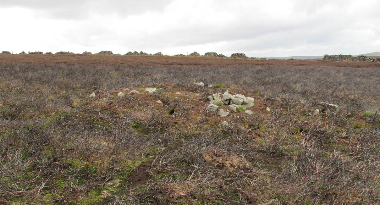 Even though much of the heather here had been burnt back when James Elkington and I visited the place recently, the pile of stones was still very embedded into the peat. The moorland rabbits had dislodged some of the stones, highlighting the mass of rocks much better. It stands nearly a metre high and is roughly 7 yards by 8 yards in diameter from edge to edge, structurally similar to the many Bronze Age cairns scattering Rombalds Moor, Askwith Moor and other Yorkshire clusters. A second cairn of similar size and stature exists some 30 yards to the southeast (visible on one of the photos).
