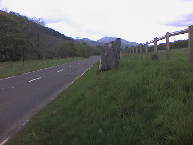 This solitary standing stone, not much more than about three feet tall, originally stood in the adjacent field and was moved to the edge of the road sometime ago. It was described briefly in William Gillies’ Breadalbane (1938) where he said, “Its height is 3 feet 10 inches and its girth at the base 6 feet 2 inches… This solitary stone is possibly the sole survivor of a group that once formed a circle,” though gives no more information to support this idea. It seems more likely that the stone accompanied a cairn, that was levelled by farming sometime in the 19th century.