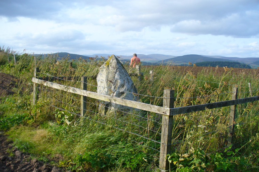 From Kirriemuir central, head up the Kinnordy road, going straight across the main road and continuing past the Kinnordy turn-off for just over a mile towards Mearns, stopping where a small copse of trees appears on your left. From here, walk along the track to the west. It goes gradually uphill, cutting through a small cleft with a hillfort on the north and a cairn circle on the south until, ⅔-mile along, you reach the moorland. Keep going on the same path for another ½-mile west where the grasslands level out. Here, on the flat bit between the two hills, a small incomplete ring of stones lives, with one stone sticking out. You’ll find it!