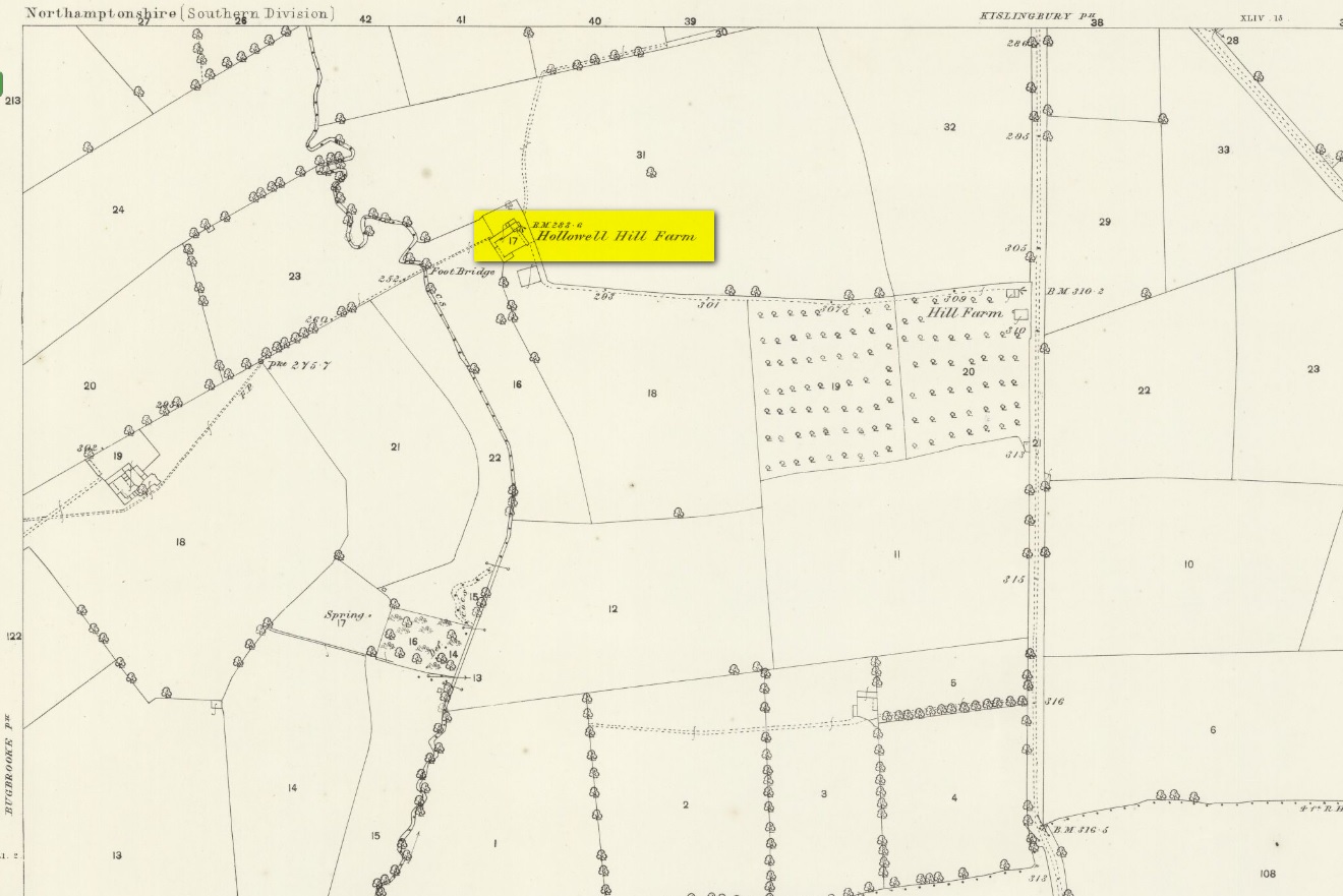 A mile south of Kislingbury village, just by the roadside is the old Hill Farm.  In times gone by—as the early OS-maps show—a trackway led from here, westwards, for just a few hundred yards, until it reached the old farm of Hollowell Hill, all trace of which has long since gone.  The farm owed its name to the existence of a holy well mentioned briefly in 14th century records in the Cartulary of St. Andrews, Northampton, where it was described as Halywellhille, or the Holy Well on a hill.  All trace of it seems to have been lost.  A ‘Spring’ that is shown on the 1885 map, a few hundred yards south of the old farm, seems to be the closest contender, but it seems more likely that the well was adjacent to, or beneath the farm-building.