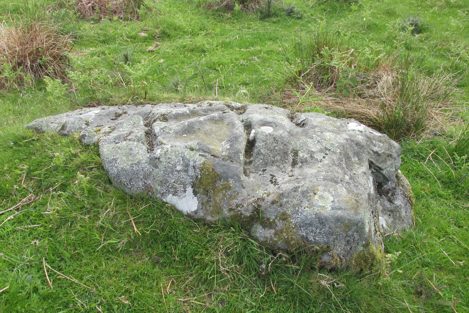 “50m E of the Ogle Burn is a boulder 2.1 x 0.9 x 0.5m, which bears 21 cup marks, 2 of which have single rings.”