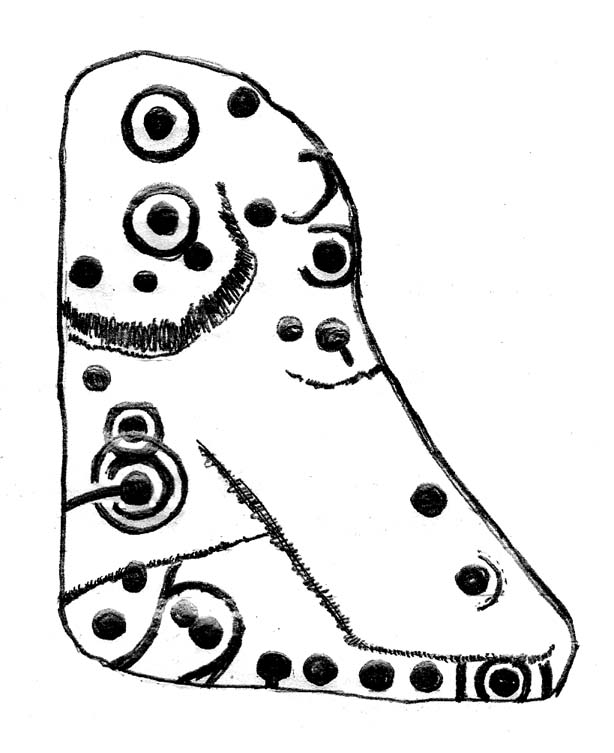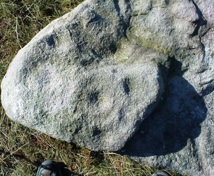We have to assume that when Mr Feather first located this stone that the faint cup-and-rings on the topmost southeast section of the rock had been exposed to the elements from Day 1, so to speak: as the designs here are quite faint and well-worn. Another not unreasonable assumption is that Mr Feather then proceeded to dig away at the rest of the rock, exposing other features on the stone which had laid under the soil for countless centuries, as the northernmost part of the carving has minimal erosion effects on it. Indeed, unless this is true, we have to start thinking that the carving was made over quite lengthy periods of time, due solely to the greater and lesser effects of weathering on different sections of the stone.
