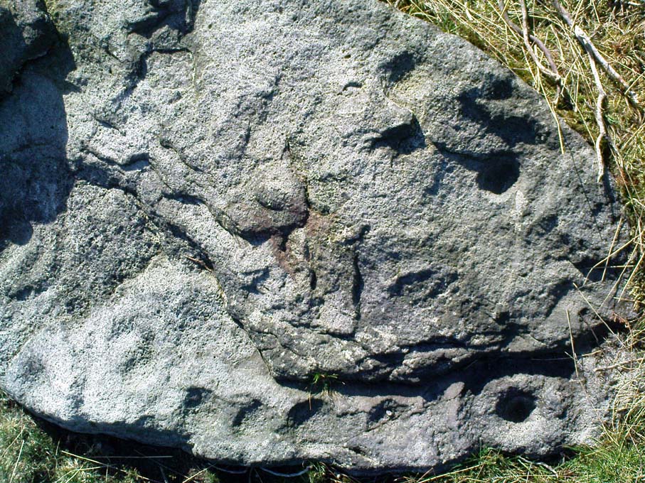 This is an excellent carving first recorded, it seems, by Stuart Feather in 1977, as cited in the Yorkshire Archaeology Journal’s ‘Listings’ for 1978. It can be found some 27 yards west of a prehistoric cairn near the top of the ridge (14 yards east of the same cairn is the Spotted Stone carving).