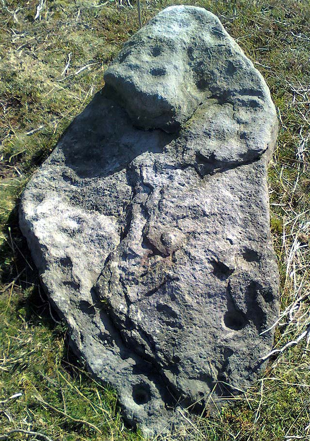 From East Morton village, take the moorland road, east, and up the steep hill. Where the road levels out there’s a right turn, plus (more importantly!) a trackway on your left which leads onto the moor. Go up this traclk and keep walking till you hit a moorland ‘footpath’ signpost. Stop here and walk due west (your left) onto the gently sloping rise of Stanbury Hill. Keep walking for a 250 yards or so, where the land has sloped gently down to the end of the spur; and just 50 yards before it drops down tot he stream below you’ll find a cluster of rocks scattered about. One of the stones here is this one!