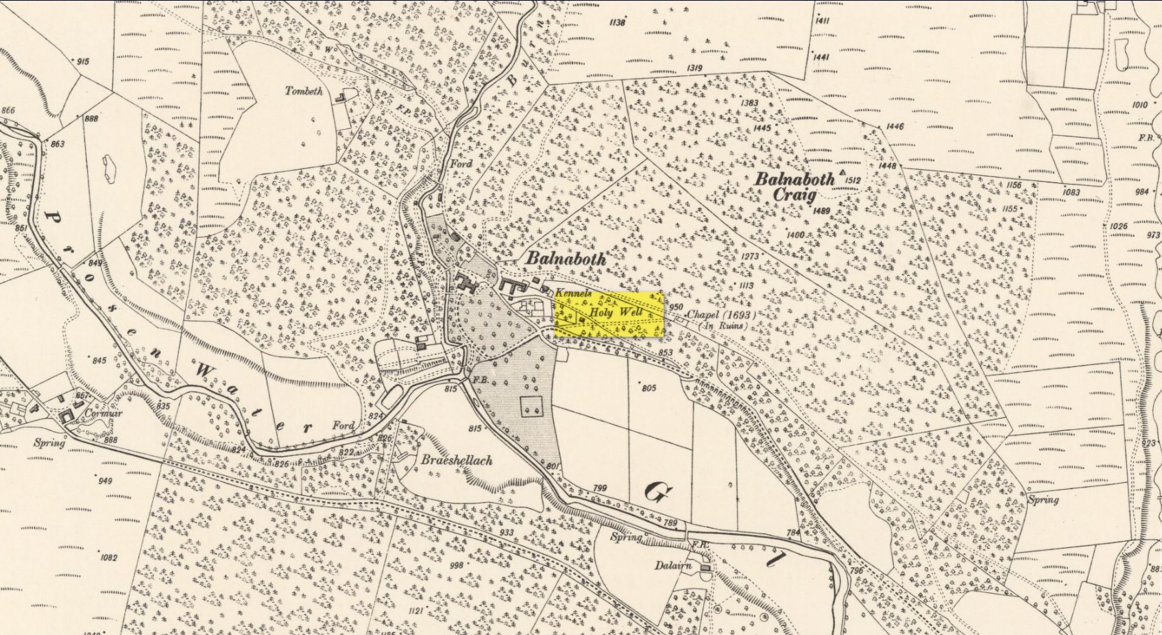 Shown on the early OS-maps, its sacrality or holy association would seem to be lost from the tongues of the older folk, most of whom seem long gone from this beautiful glen-to-nowhere. The only remaining religious connection we might have relating to the place comes from the ruined 17th century chapel less than 250 yards away to the west on the slope above the track, from where a singular stone-lined footpath runs dead straight to the well.