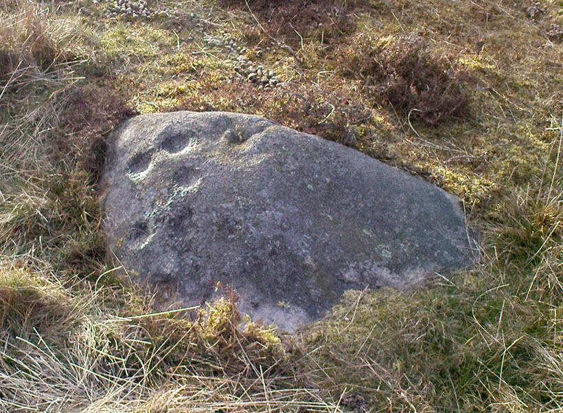 If you’re gonna come up this region, this is the carving you’ll most wanna check out. It’s the most ornamented of all the cup-and-ring stones at the top of Delves Beck. Comprising at least five full cup-and-rings and a number of single cups, carved on a roughly square flat rock, it was first found by Stuart Feather in the mid-1960s. It sits amidst a cluster of many other carvings on the same ridge. This (for me at least) is something of a curiosity, inasmuch as we have a seeming lack of other prehistoric remains in attendance.