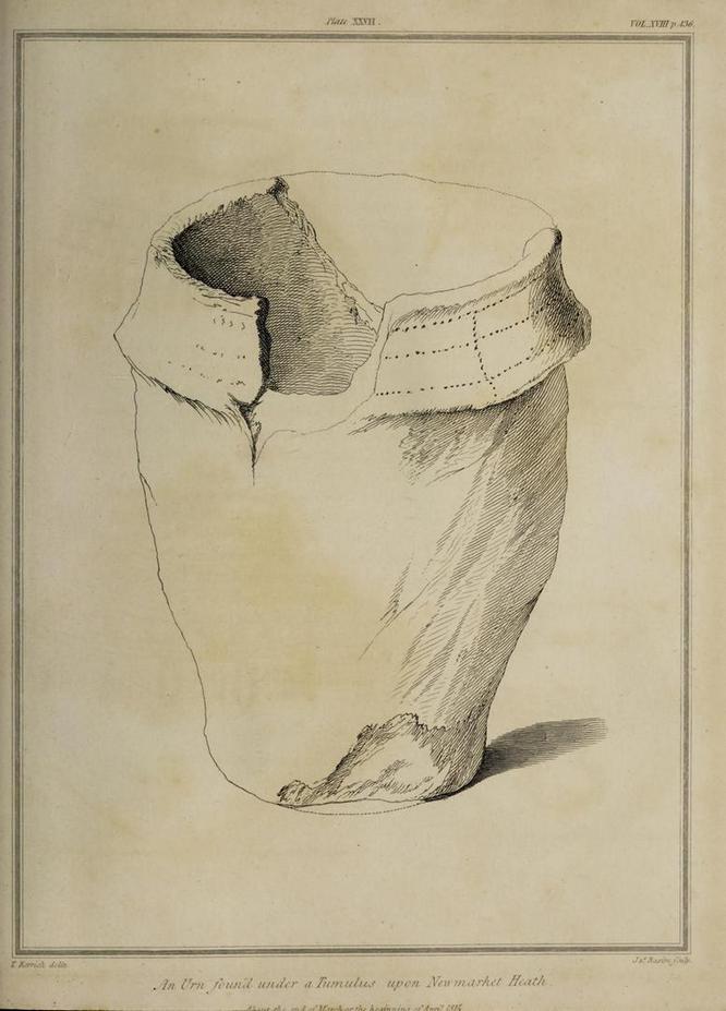 “The Rev. Thomas Kerrich…exhibited to the Society, an Urn, which had been found a few days before by some labourers who were employed to remove one of the Barrows upon Newmarket-heath, called the Beacon Hills. “It stood upon what probably was the surface of the earth before the tumulus was raised.  The diameter of the barrow was near thirty yards, and the perpendicular height probably about eight or nine feet. There are more of these tumuli remaining, some of them very near to the place on which this, out of which the urn came, lately stood. They command an extensive view over the town of Cambridge, Gog-Magog Hills, &c.”