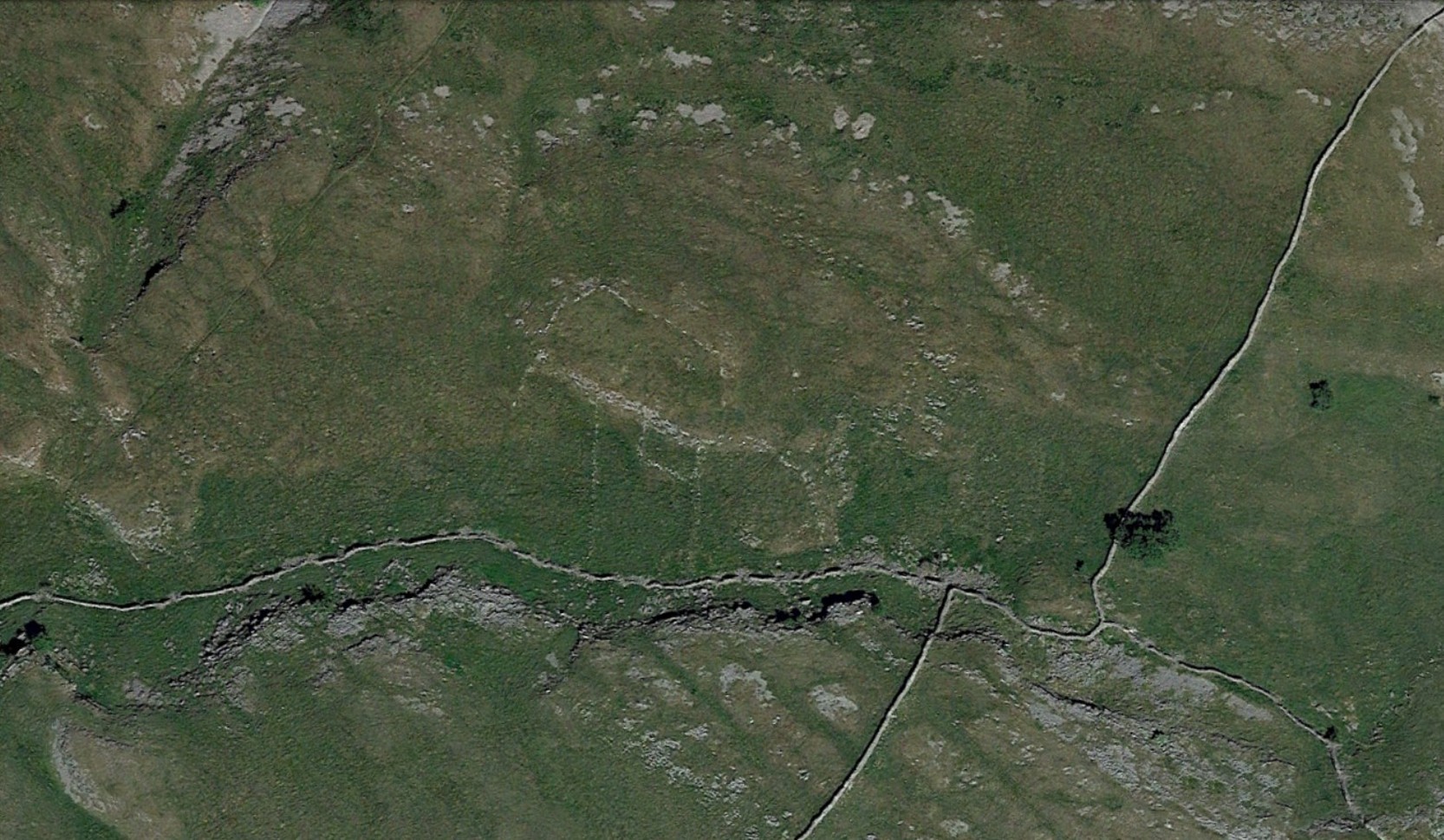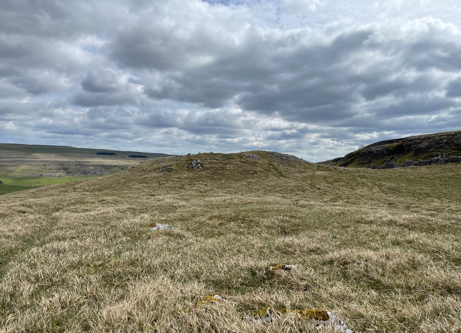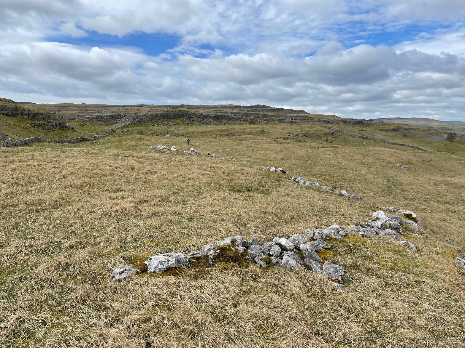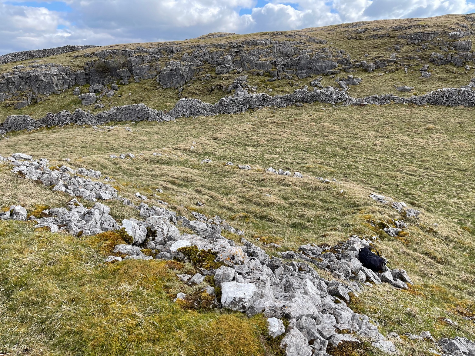 Go up the B6160 road from Grassington to Kettlewell and just a few hundred yards past the famous Kilnsey Crags, take the little road to Arncliffe on your left. After ¾ of a mile, keep your eyes peeled for the small parking spot on the left-side of the road, with the steep rocky stream that leads up to the Sleet Gill Cave. Walk up to the cave, then keep going up the same steep slope to the wall/fence above. You can get over the wooden fence and keep following the wall until it just about levels out nearly 200 yards up. From here, walk 100 yards to your right where the land rises up and you’re at the edge of the walled enclosure. Look around.