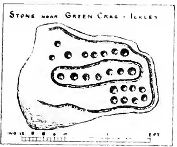 “The stone is of grit, and measure 3ft 2ins, by 2ft 6ins. Its upper surface is nearly horizontal, and has carved upon it cups varying in diameter from 2ins to 3ins. A row of cups in the middle of the stone are entirely surrounded by a groove. There is also a channel running round the outside. Single cups are often found encircled by one or more concentric rings; but it is very exceptional indeed to find several cups surrounded by a single groove, or to find the cups so symmetrically arranged as in the present instance.”