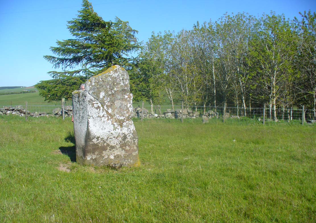 Take the B934 road south, uphill, out of Dunning, for 2.1 miles (3.4km), past Kippen, past Pitmeadow and past Quilts.  It’s the track to Knowes that you’re after!  Along this track, keep to the field-side on your right, following the edge of the fencing until you reach the small copse of trees.  At the far side of the trees a gate takes you into the field with the standing stone, which is just over 100 yards to the north. You can’t miss it!
