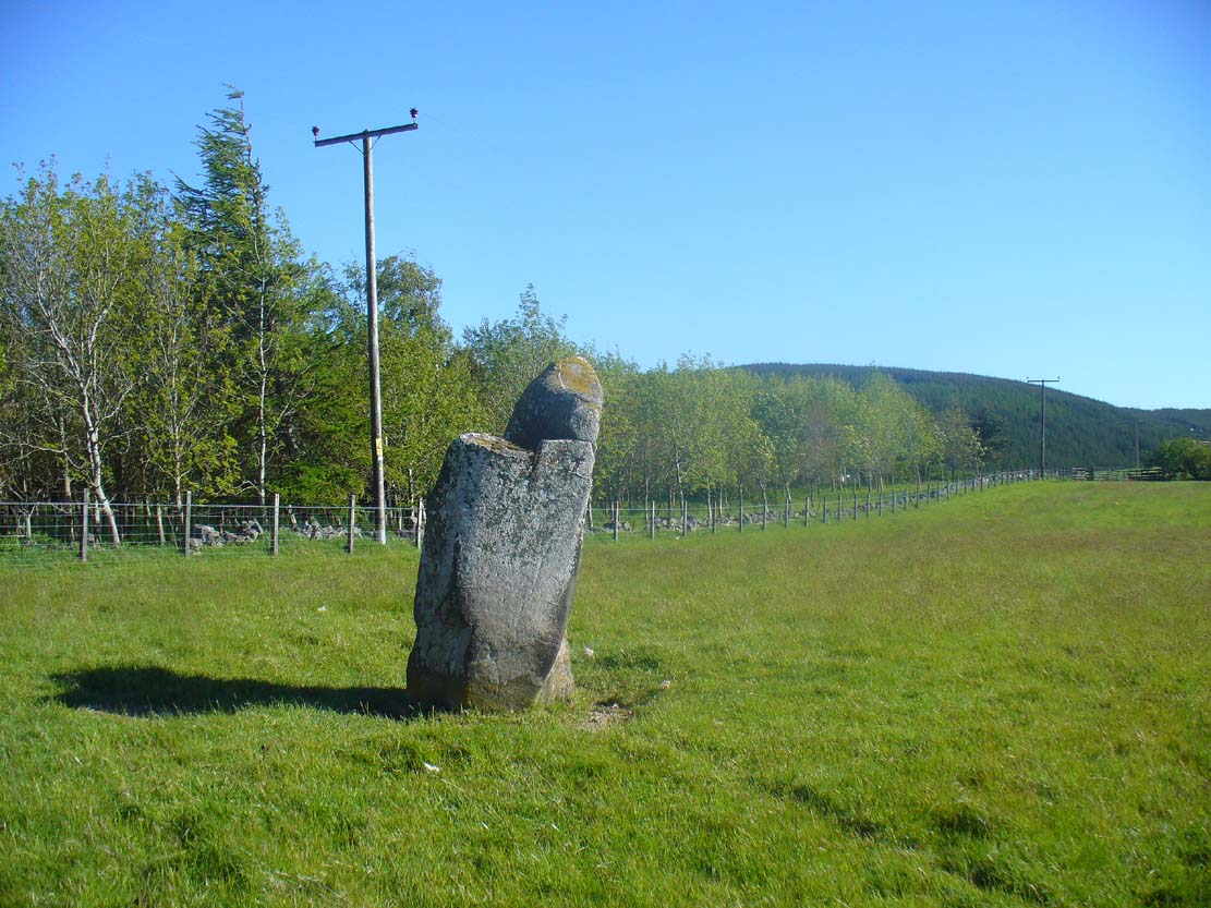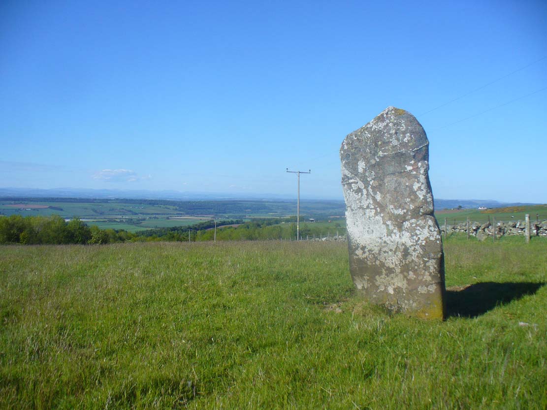 Although mentioned in several folklore works and just a couple of archaeology tomes, almost nothing has been written about this large upright standing stone.  A very bulky stone nearly seven feet tall, it has been broken into pieces at sometime in the recent past but, thankfully, good locals put the stone back together and placed it upright once again.  Its position in the landscape is quite superb, overlooking the lowlands of Tayside below and then far into the rising mountains of Perthshire and beyond, easy fifty miles or more.