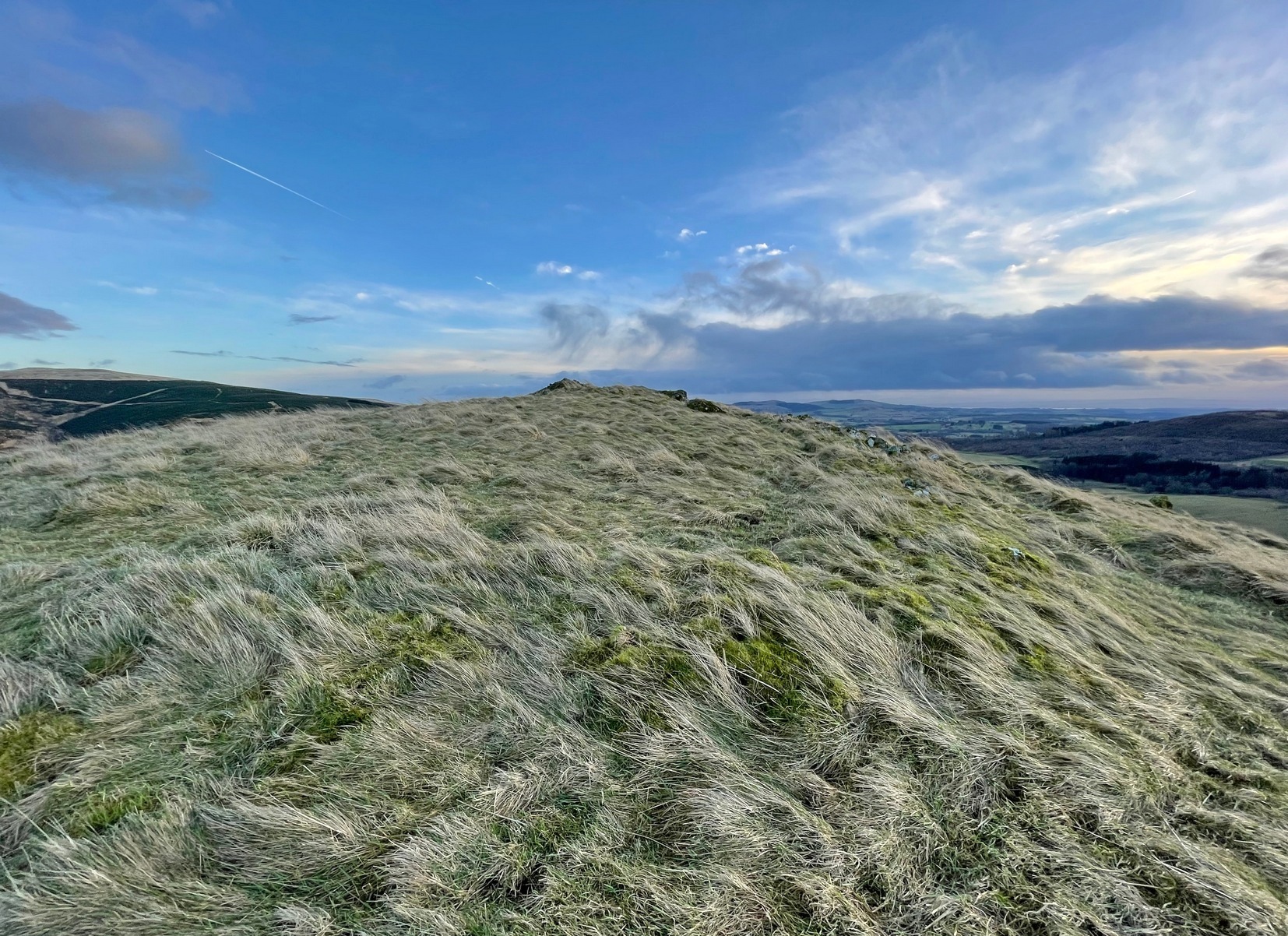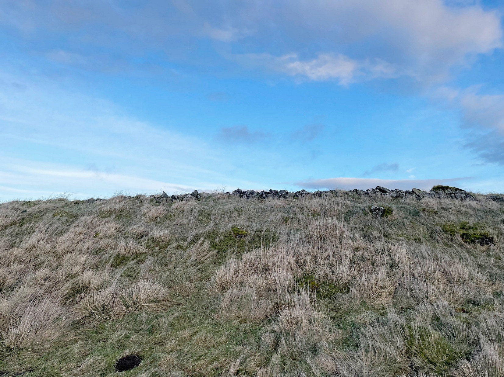 Once on top, the views are superb!  But I couldn’t really take it in on my short visit here as the freezing wind was truly incredible and I could barely stand upright.  And so I briskly followed to the quite notable stone-walled edges of the main prehistoric “enclosure” and walked round the edges as best I could, hoping that at least one or two of the photos I was taking weren’t too blurred.