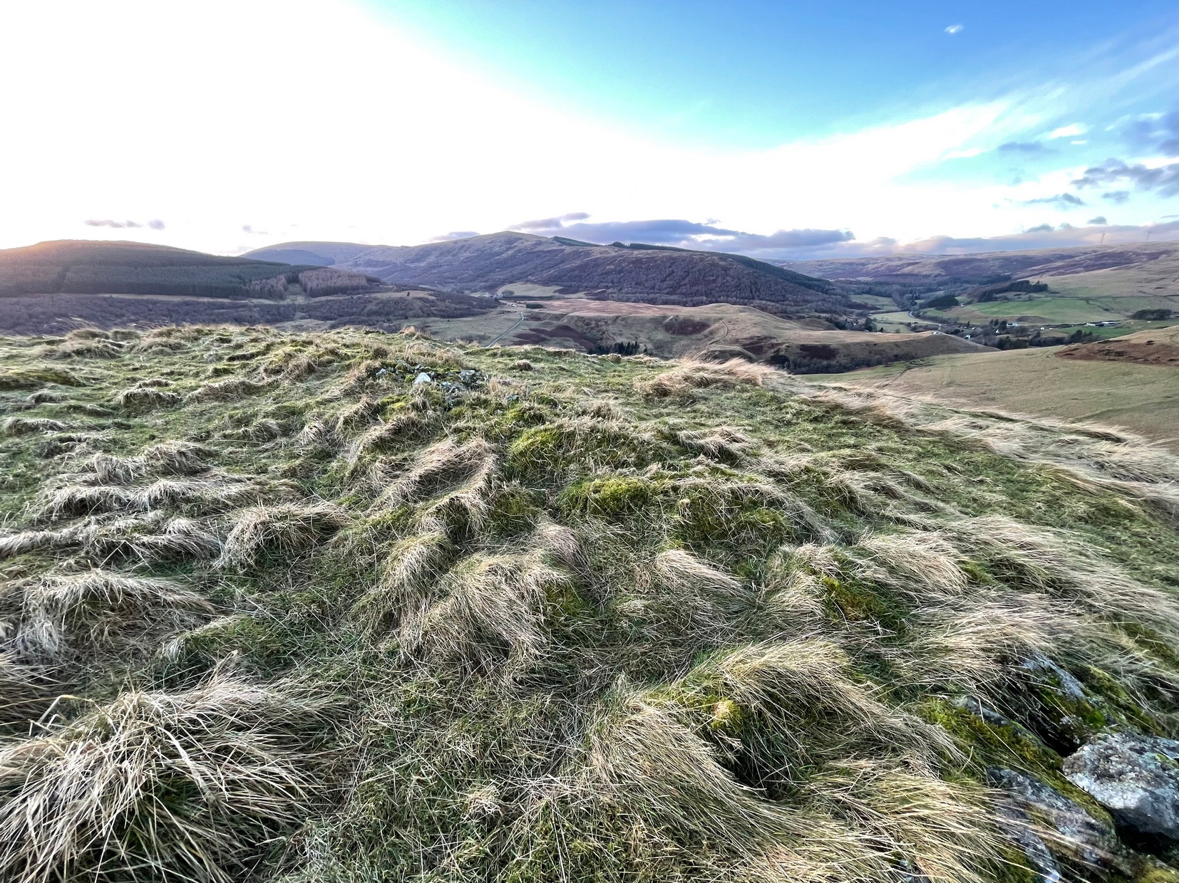Travelling north along the A823 Glendevon road (between Muckhart and Gleneagles), barely 2 miles after Muckhart, on your right you’ll see the large Castlehill reservoir.  Park here.  Across the waters is the large Down Hill—which the hillfort crowns.  So, just walk back the way you came along the road for nearly 600 yards and then turn left to walk onto the other side of the water, round to the very end of the track and then up the path into the trees.  Walk along this winding path for 300 yards until you reach the track that takes you (left) up to Downhill Farm.  One way or the other, past there, just stagger up to the top of the hill!