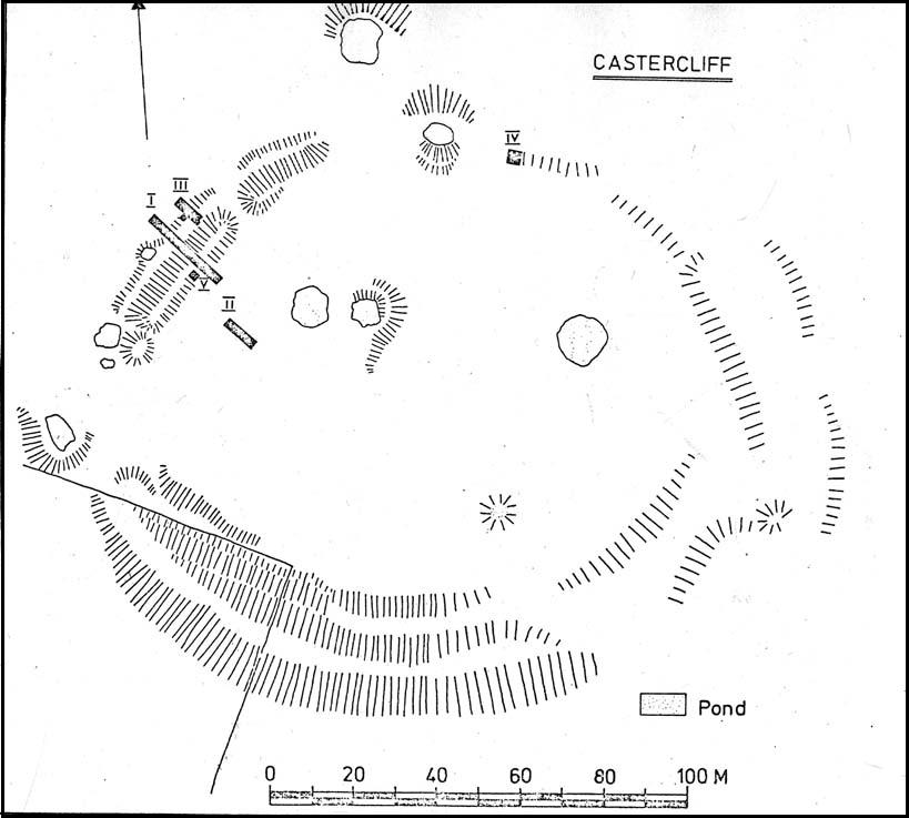 “His work was concentrated in the northwest corner of the site where he cut a trench through the defences. Outside the counterscarp bank, which was not continuous, there was a bedding trench, packed with stones and containing charcoal. The ditch, which was rock-cut and flat-bottomed, had a homogenous fill. The rampart itself showed timber supports at the front and back with traces of stone revetting at the front and some distance from the timber uprights. The rear of the rampart was marked by a line of stones. Behind this rampart the site had been extensively disturbed and here he claimed to have found traces of primitive iron-smelting furnaces constructed from stones packed and sealed with loose black earth. A single post-hole beneath the rampart was suggested to belong to an earlier phase.”